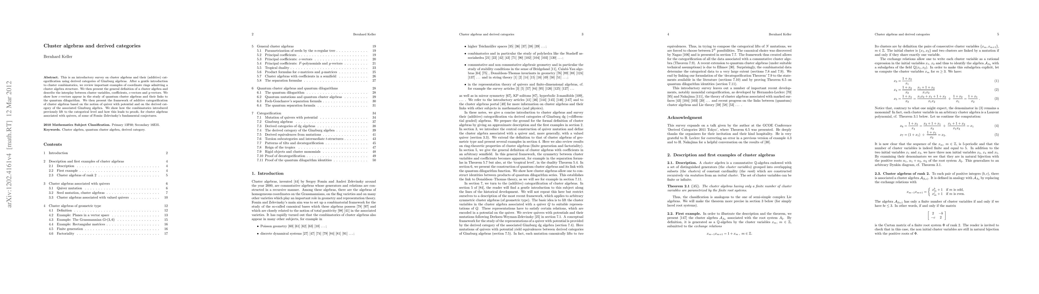 This paper surveys cluster algebras and their categorification using derived categories of Ginzburg algebras, detailing the combinatorial structures and their categorical implications, and proving some conjectures related to quivers.