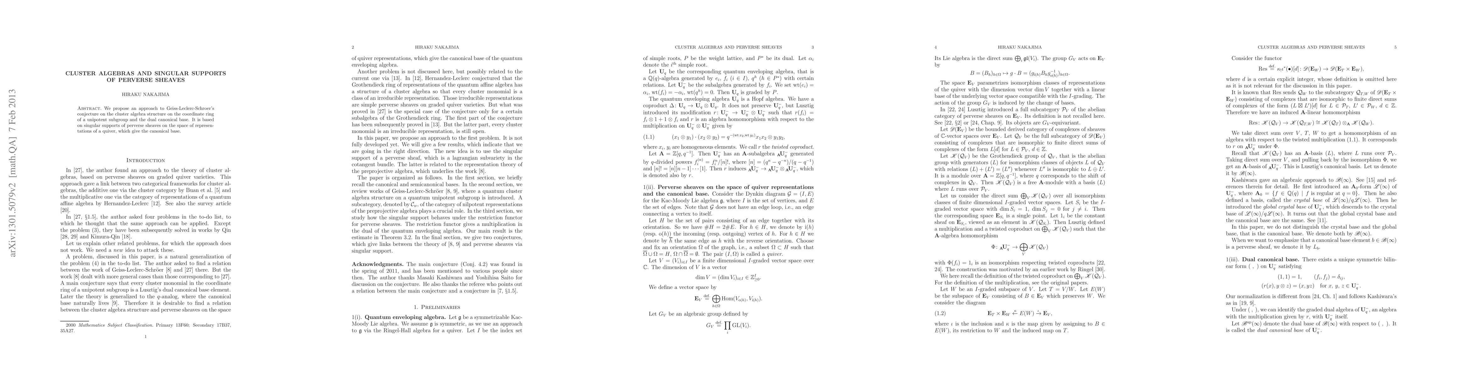 We propose an approach to Geiss-Leclerc-Schroer's conjecture on the cluster algebra structure on the coordinate ring of a unipotent subgroup and the dual canonical base. It is based on singular supports of perverse sheaves on the space of representations of a quiver, which give the canonical base.