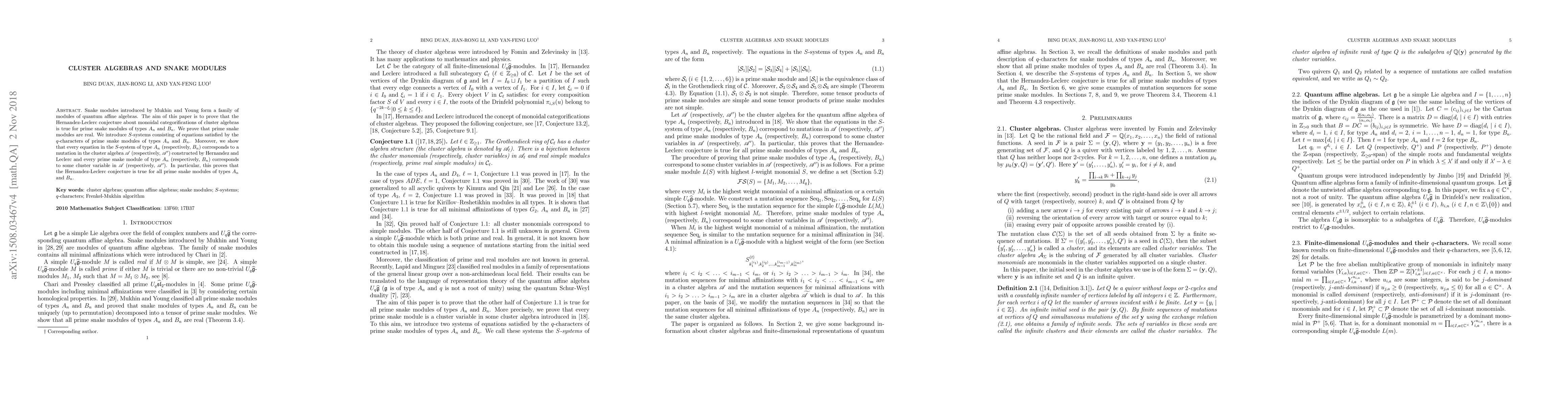 Snake modules introduced by Mukhin and Young form a family of modules of quantum affine algebras. The aim of this paper is to prove that the Hernandez-Leclerc conjecture about monoidal categorifications of cluster algebras is true for prime snake modules of types $A_{n}$ and $B_{n}$. We prove that prime snake modules are real. We introduce $S$-systems consisting of equations satisfied by the $q$-characters of prime snake modules of types $A_{n}$ and $B_{n}$. Moreover, we show that every equation in the $S$-system of type $A_n$ (respectively, $B_n$) corresponds to a mutation in the cluster algebra $\mathscr{A}$ (respectively, $\mathscr{A}'$) constructed by Hernandez and Leclerc and every prime snake module of type $A_n$ (respectively, $B_n$) corresponds to some cluster variable in $\mathscr{A}$ (respectively, $\mathscr{A}'$). In particular, this proves that the Hernandez-Leclerc conjecture is true for all prime snake modules of types $A_{n}$ and $B_{n}$.