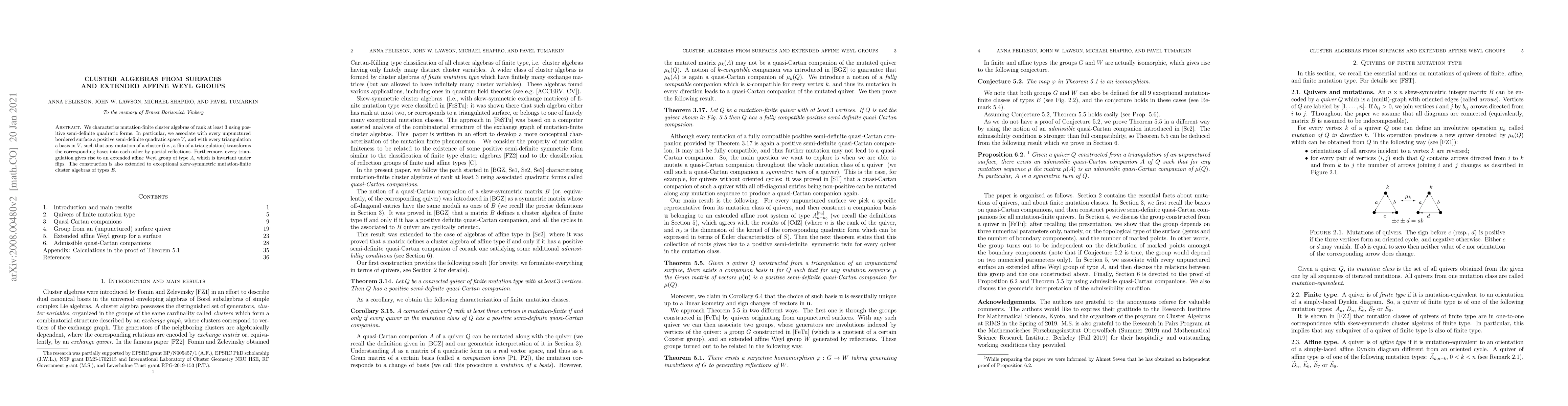 We characterize mutation-finite cluster algebras of rank at least 3 using positive semi-definite quadratic forms. In particular, we associate with every unpunctured bordered surface a positive semi-definite quadratic space $V$, and with every triangulation a basis in $V$, such that any mutation of a cluster (i.e., a flip of a triangulation) transforms the corresponding bases into each other by partial reflections. Furthermore, every triangulation gives rise to an extended affine Weyl group of type $A$, which is invariant under flips. The construction is also extended to exceptional skew-symmetric mutation-finite cluster algebras of types $E$.