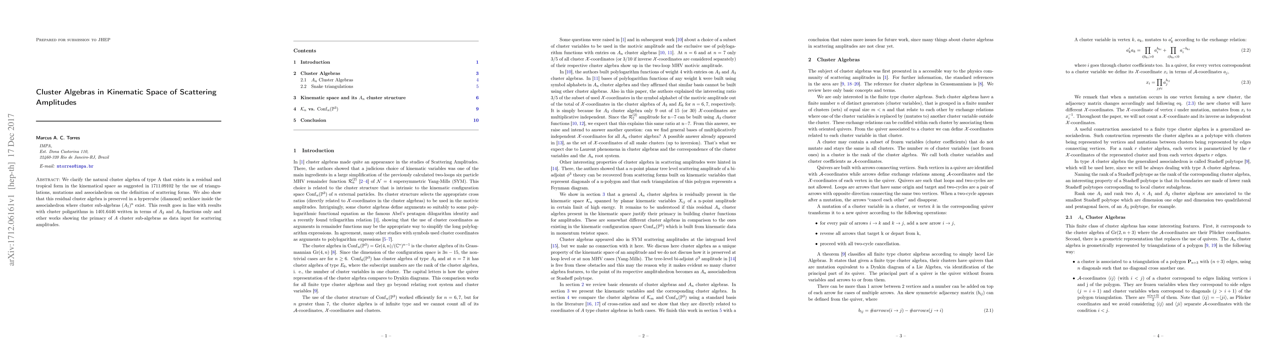 We clarify the natural cluster algebra of type A that exists in a residual and tropical form in the kinematical space as suggested in 1711.09102 by the use of triangulations, mutations and associahedron on the definition of scattering forms. We also show that this residual cluster algebra is preserved in a hypercube (diamond) necklace inside the associahedron where cluster sub-algebras $(A_1)^n$ exist. This result goes in line with results with cluster poligarithms in 1401.6446 written in terms of $A_2$ and $A_3$ functions only and other works showing the primacy of $A$ cluster sub-algebras as data input for scattering amplitudes.