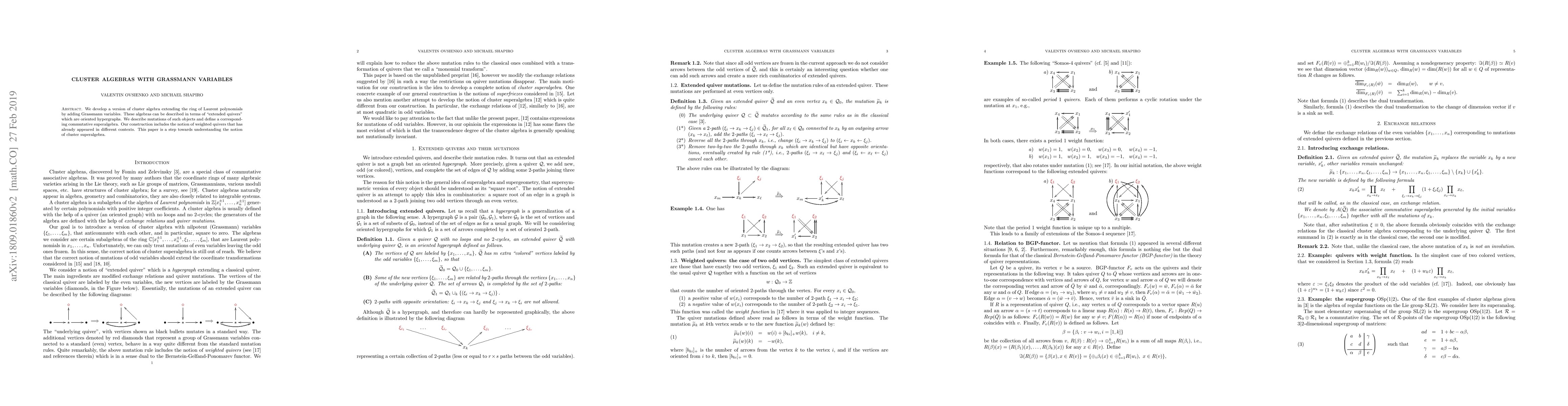 Researchers extend cluster algebra to include Grassmann variables, creating a new superalgebra with 'extended quivers' that describe weighted hypergraphs. This work aims to better understand the concept of cluster superalgebra and its connections to other mathematical fields.