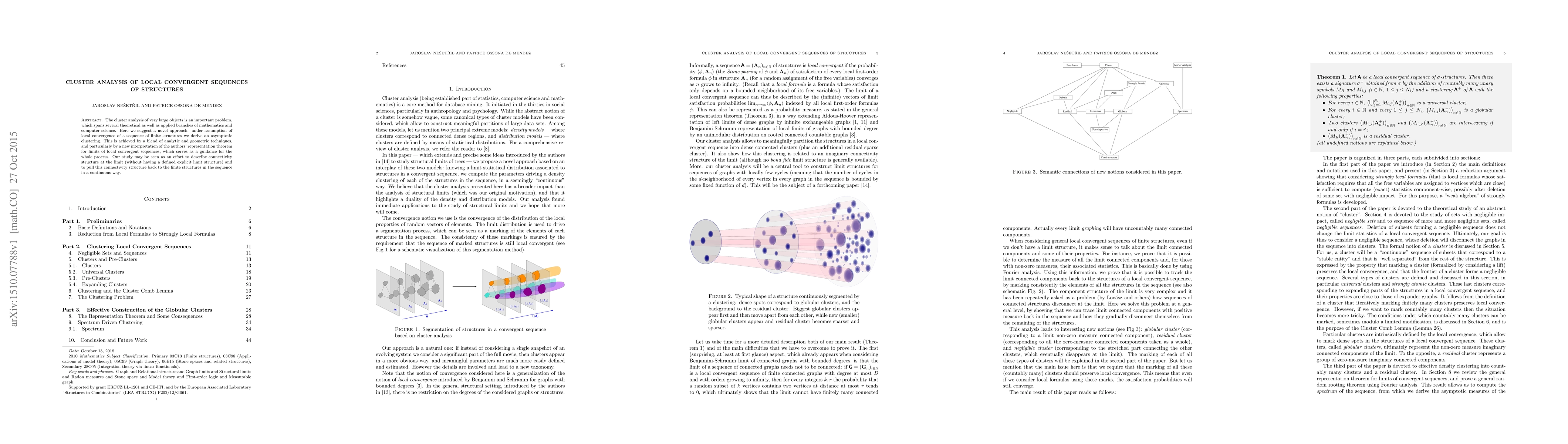 The cluster analysis of very large objects is an important problem, which spans several theoretical as well as applied branches of mathematics and computer science. Here we suggest a novel approach: under assumption of local convergence of a sequence of finite structures we derive an asymptotic clustering. This is achieved by a blend of analytic and geometric techniques, and particularly by a new interpretation of the authors' representation theorem for limits of local convergent sequences, which serves as a guidance for the whole process. Our study may be seen as an effort to describe connectivity structure at the limit (without having a defined explicit limit structure) and to pull this connectivity structure back to the finite structures in the sequence in a continuous way.