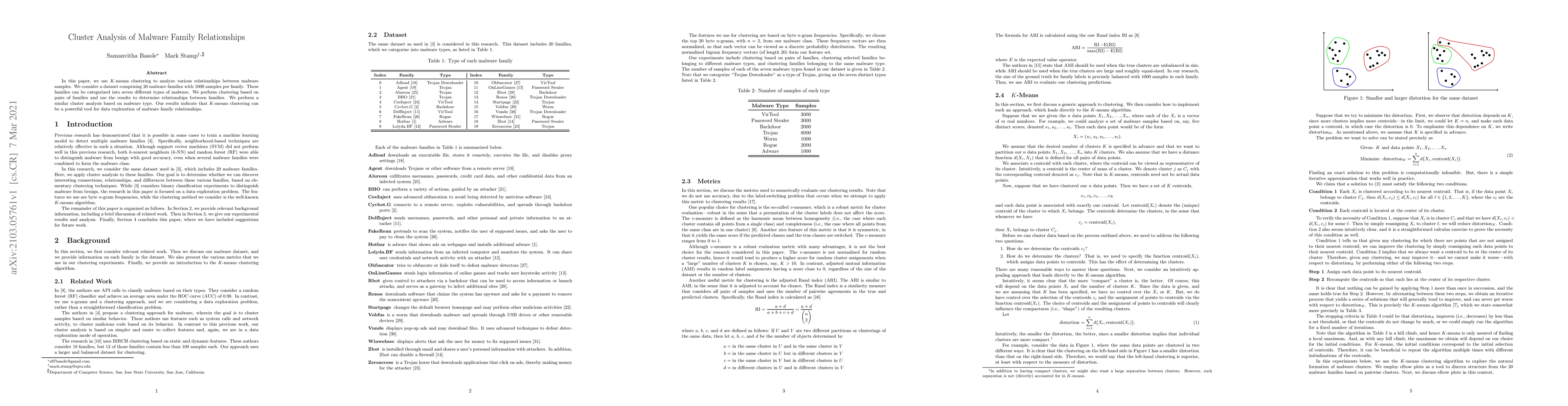 This paper employs $K$-means clustering to explore relationships between 20 malware families, each containing 1000 samples, categorized into seven types. The analysis reveals significant insights into family connections and highlights the effectiveness of $K$-means clustering for malware data exploration.