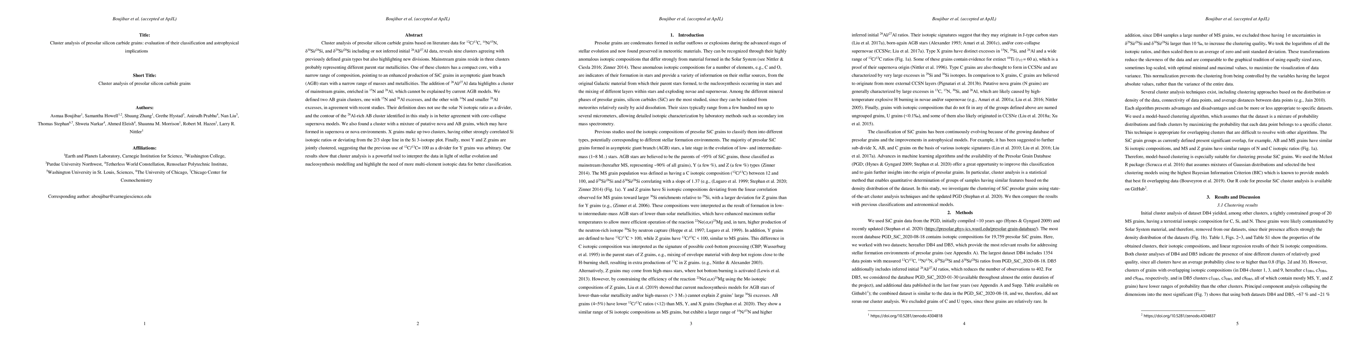 Cluster analysis of presolar silicon carbide grains based on literature data for 12C/13C, 14N/15N, {\delta}30Si/28Si, and {\delta}29Si/28Si including or not inferred initial 26Al/27Al data, reveals nine clusters agreeing with previously defined grain types but also highlighting new divisions. Mainstream grains reside in three clusters probably representing different parent star metallicities. One of these clusters has a compact core, with a narrow range of composition, pointing to an enhanced production of SiC grains in asymptotic giant branch (AGB) stars with a narrow range of masses and metallicities. The addition of 26Al/27Al data highlights a cluster of mainstream grains, enriched in 15N and 26Al, which cannot be explained by current AGB models. We defined two AB grain clusters, one with 15N and 26Al excesses, and the other with 14N and smaller 26Al excesses, in agreement with recent studies. Their definition does not use the solar N isotopic ratio as a divider, and the contour of the 26Al-rich AB cluster identified in this study is in better agreement with core-collapse supernova models. We also found a cluster with a mixture of putative nova and AB grains, which may have formed in supernova or nova environments. X grains make up two clusters, having either strongly correlated Si isotopic ratios or deviating from the 2/3 slope line in the Si 3-isotope plot. Finally, most Y and Z grains are jointly clustered, suggesting that the previous use of 12C/13C= 100 as a divider for Y grains was arbitrary. Our results show that cluster analysis is a powerful tool to interpret the data in light of stellar evolution and nucleosynthesis modelling and highlight the need of more multi-element isotopic data for better classification.