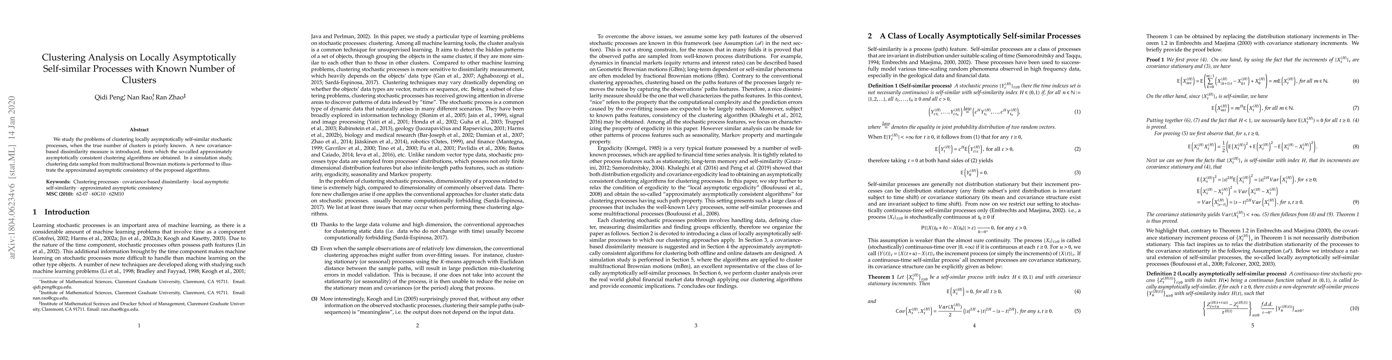 We conduct cluster analysis on a class of locally asymptotically self-similar stochastic processes, which includes multifractional Brownian motion as a representative. When the true number of clusters is supposed to be known, a new covariance-based dissimilarity measure is introduced, from which we obtain the approximately asymptotically consistent clustering algorithms. In simulation studies, clustering data sampled from multifractional Brownian motions with distinct functional Hurst parameters illustrates the approximated asymptotic consistency of the proposed algorithms. Clustering global financial markets' equity indexes returns and sovereign CDS spreads provides a successful real world application.