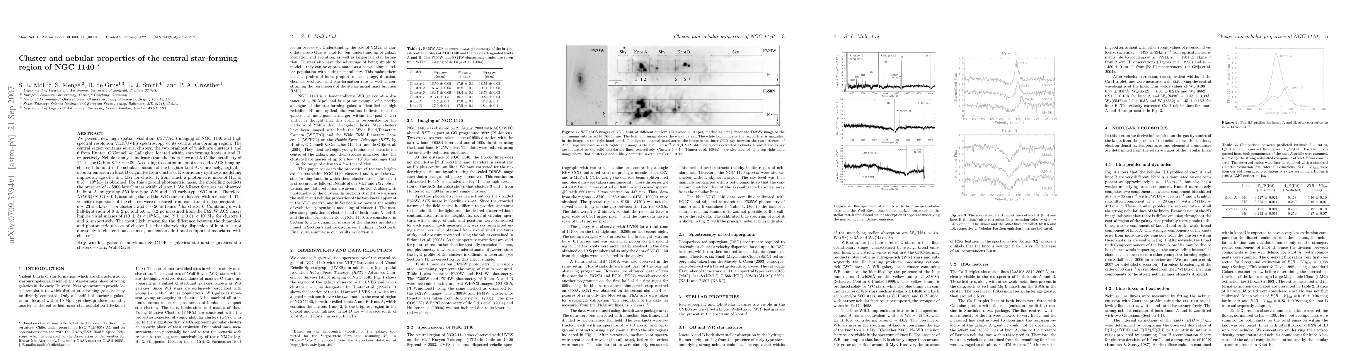 We present new high spatial resolution HST/ACS imaging of NGC 1140 and high spectral resolution VLT/UVES spectroscopy of its central star-forming region. The central region contains several clusters, the two brightest of which are clusters 1 and 6 from Hunter, O'Connell & Gallagher, located within star-forming knots A and B, respectively. Nebular analysis indicates that the knots have an LMC-like metallicity of 12 + log(O/H) = 8.29 +/- 0.09. According to continuum subtracted H alpha ACS imaging, cluster 1 dominates the nebular emission of the brighter knot A. Conversely, negligible nebular emission in knot B originates from cluster 6. Evolutionary synthesis modelling implies an age of 5 +/- 1 Myr for cluster 1, from which a photometric mass of (1.1 +/- 0.3) x 10^6 Msun is obtained. For this age and photometric mass, the modelling predicts the presence of ~5900 late O stars within cluster 1. Wolf-Rayet features are observed in knot A, suggesting 550 late-type WN and 200 early-type WC stars. Therefore, N(WR)/N(O) ~ 0.1, assuming that all the WR stars are located within cluster 1. The velocity dispersions of the clusters were measured from constituent red supergiants as sigma ~ 23 +/- 1 km/s for cluster 1 and sigma ~ 26 +/- 1 km/s for cluster 6. Combining sigma with half-light radii of 8 +/- 2 pc and 6.0 +/- 0.2 pc measured from the F625W ACS image implies virial masses of (10 +/- 3) x 10^6 Msun and (9.1 +/- 0.8) x 10^6 Msun for clusters 1 and 6, respectively. The most likely reason for the difference between the dynamical and photometric masses of cluster 1 is that the velocity dispersion of knot A is not due solely to cluster 1, as assumed, but has an additional component associated with cluster 2.