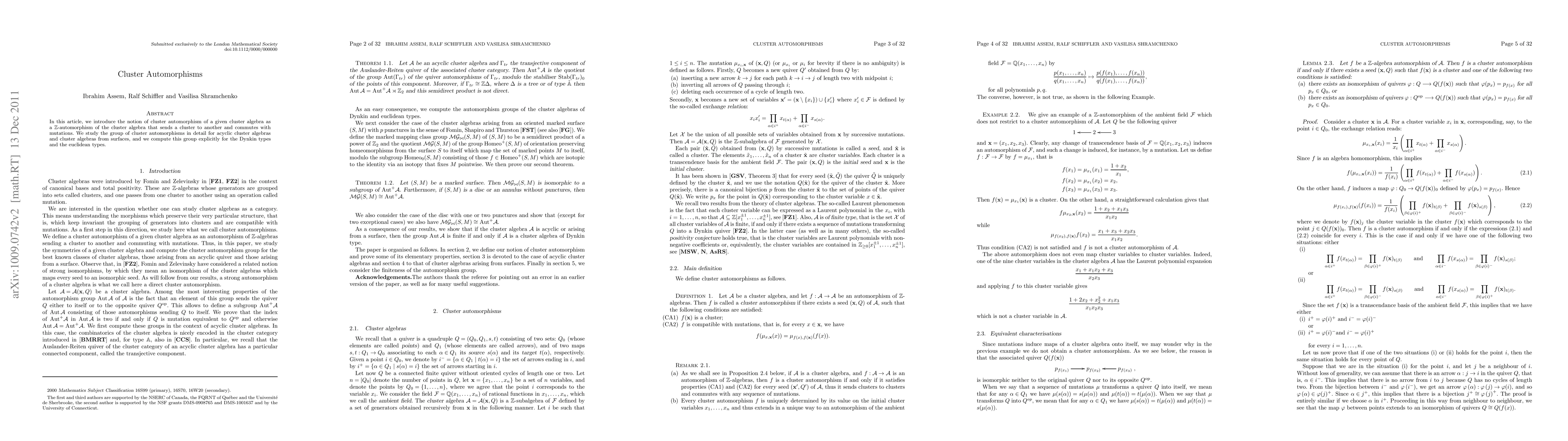 This paper introduces cluster automorphisms as transformations of cluster algebras that preserve clusters and commute with mutations, and computes the group for Dynkin and Euclidean types in detail.