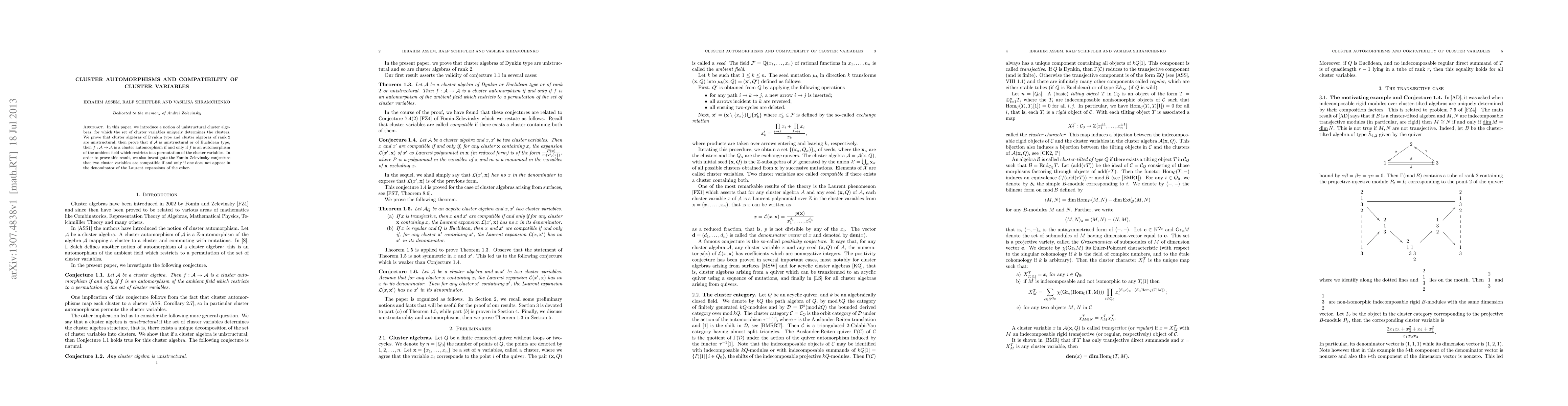 In this paper, we introduce a notion of unistructural cluster algebras, for which the set of cluster variables uniquely determines the clusters. We prove that cluster algebras of Dynkin type and cluster algebras of rank 2 are unistructural, then prove that if $\mathcal{A}$ is unistructural or of Euclidean type, then $f: \mathcal{A}\to \mathcal{A}$ is a cluster automorphism if and only if $f$ is an automorphism of the ambient field which restricts to a permutation of the cluster variables. In order to prove this result, we also investigate the Fomin-Zelevinsky conjecture that two cluster variables are compatible if and only if one does not appear in the denominator of the Laurent expansions of the other.