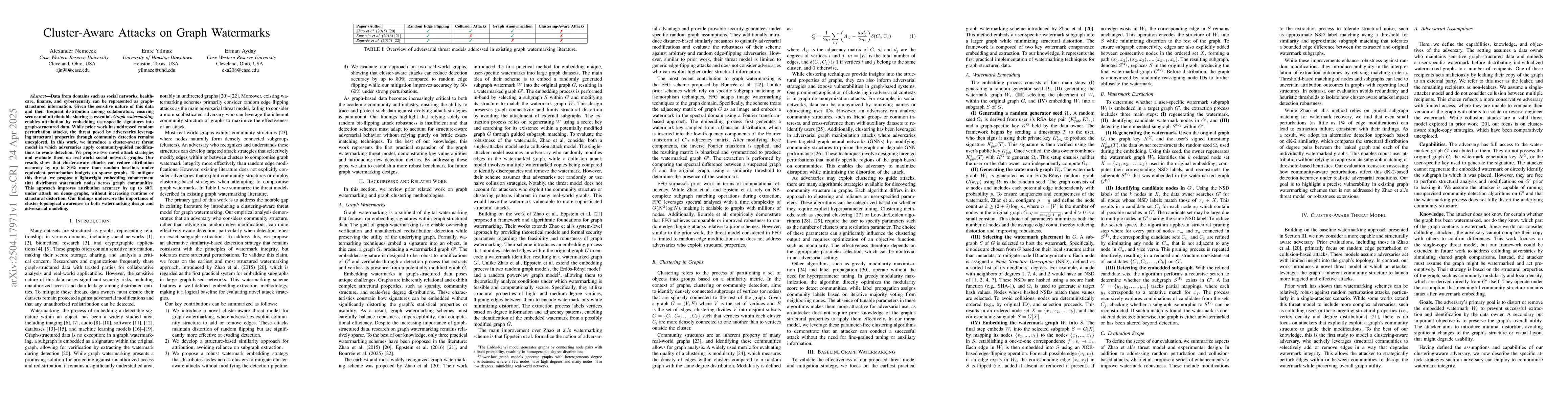 This work is novel in its introduction of a cluster-aware threat model for graph watermarking, addressing a previously unexplored aspect of adversarial attacks on graph watermarking systems.