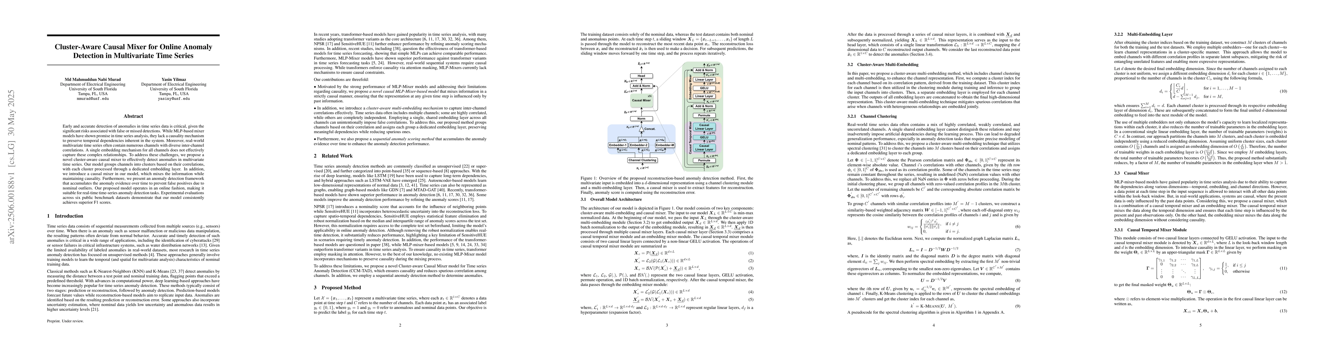 This work stands out by introducing a cluster-aware approach to embedding layers and incorporating a causal mixer to preserve temporal dependencies in multivariate time series anomaly detection.