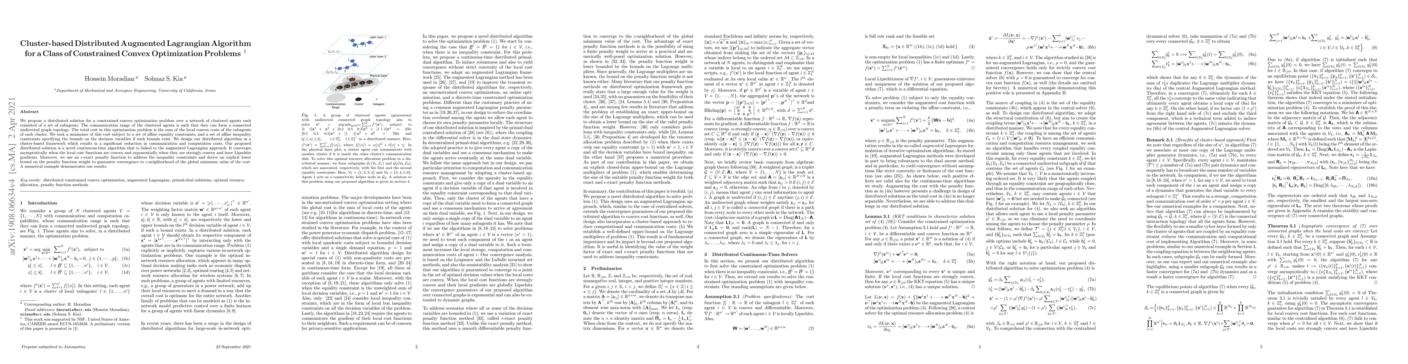 We propose a distributed solution for a constrained convex optimization problem over a network of clustered agents each consisted of a set of subagents. The communication range of the clustered agents is such that they can form a connected undirected graph topology. The total cost in this optimization problem is the sum of the local convex costs of the subagents of each cluster. We seek a minimizer of this cost subject to a set of affine equality constraints, and a set of affine inequality constraints specifying the bounds on the decision variables if such bounds exist. We design our distributed algorithm in a cluster-based framework which results in a significant reduction in communication and computation costs. Our proposed distributed solution is a novel continuous-time algorithm that is linked to the augmented Lagrangian approach. It converges asymptotically when the local cost functions are convex and exponentially when they are strongly convex and have Lipschitz gradients. Moreover, we use an $\epsilon$-exact penalty function to address the inequality constraints and derive an explicit lower bound on the penalty function weight to guarantee convergence to $\epsilon$-neighborhood of the global minimum value of the cost. A numerical example demonstrates our results.