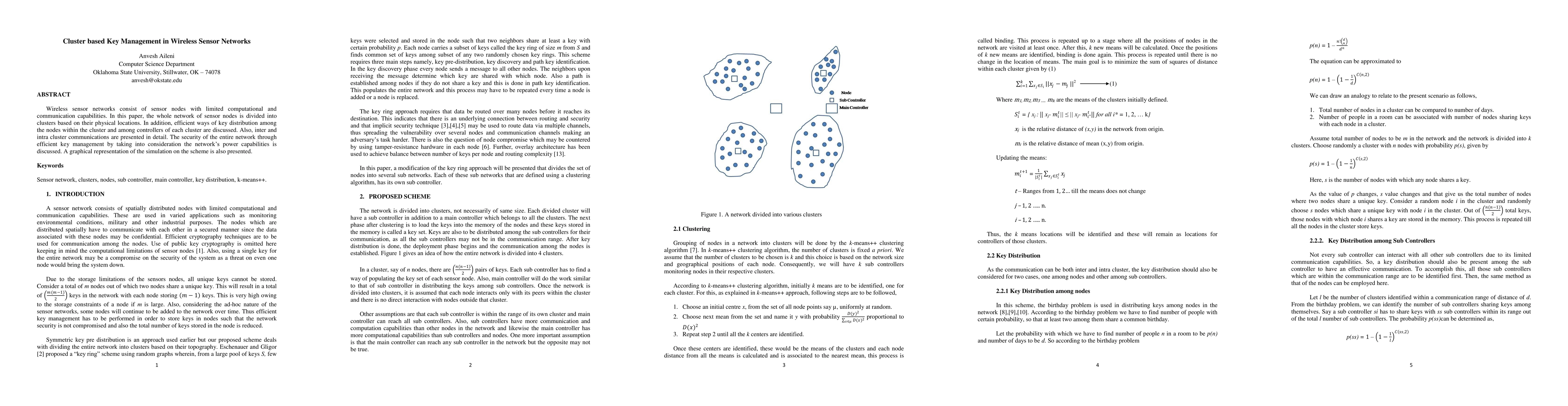 The paper proposes a cluster-based key management scheme for wireless sensor networks, dividing the network into clusters and distributing keys efficiently among nodes and sub-controllers within and across clusters.