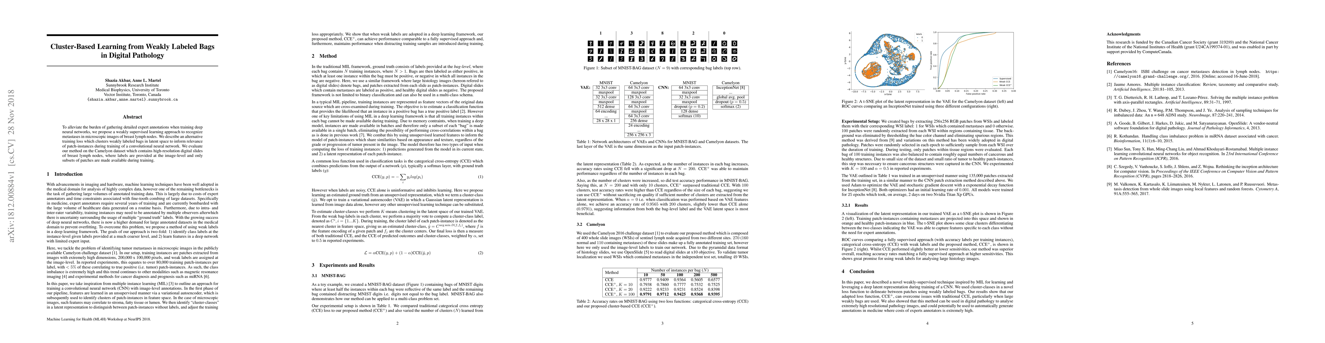 To alleviate the burden of gathering detailed expert annotations when training deep neural networks, we propose a weakly supervised learning approach to recognize metastases in microscopic images of breast lymph nodes. We describe an alternative training loss which clusters weakly labeled bags in latent space to inform relevance of patch-instances during training of a convolutional neural network. We evaluate our method on the Camelyon dataset which contains high-resolution digital slides of breast lymph nodes, where labels are provided at the image-level and only subsets of patches are made available during training.