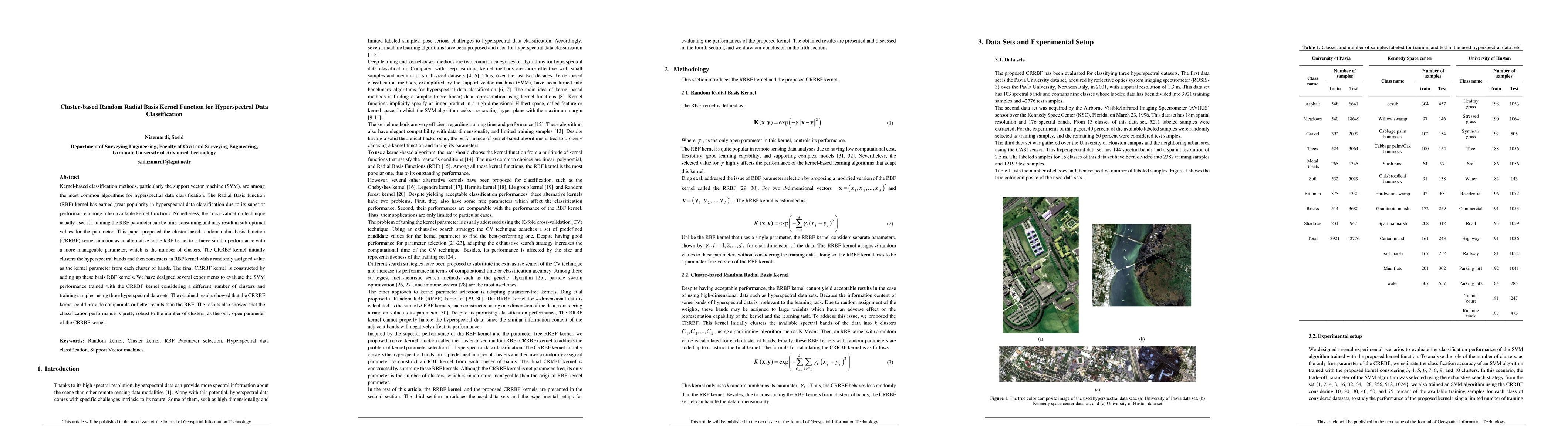 Kernel-based classification methods, particularly the support vector machine (SVM), are among the most common algorithms for hyperspectral data classification. The Radial Basis function (RBF) kernel has earned great popularity in hyperspectral data classification due to its superior performance among other available kernel functions. Nonetheless, the cross-validation technique usually used for tunning the RBF parameter can be time-consuming and may result in sub-optimal values for the parameter. This paper proposed the cluster-based random radial basis function (CRRBF) kernel function as an alternative to the RBF kernel to achieve similar performance with a more manageable parameter, which is the number of clusters. The CRRBF kernel initially clusters the hyperspectral bands and then constructs an RBF kernel with a randomly assigned value as the kernel parameter from each cluster of bands. The final CRRBF kernel is constructed by adding up these basis RBF kernels. We have designed several experiments to evaluate the SVM performance trained with the CRRBF kernel considering a different number of clusters and training samples, using three hyperspectral data sets. The obtained results showed that the CRRBF kernel could provide comparable or better results than the RBF. The results also showed that the classification performance is pretty robust to the number of clusters, as the only open parameter of the CRRBF kernel.