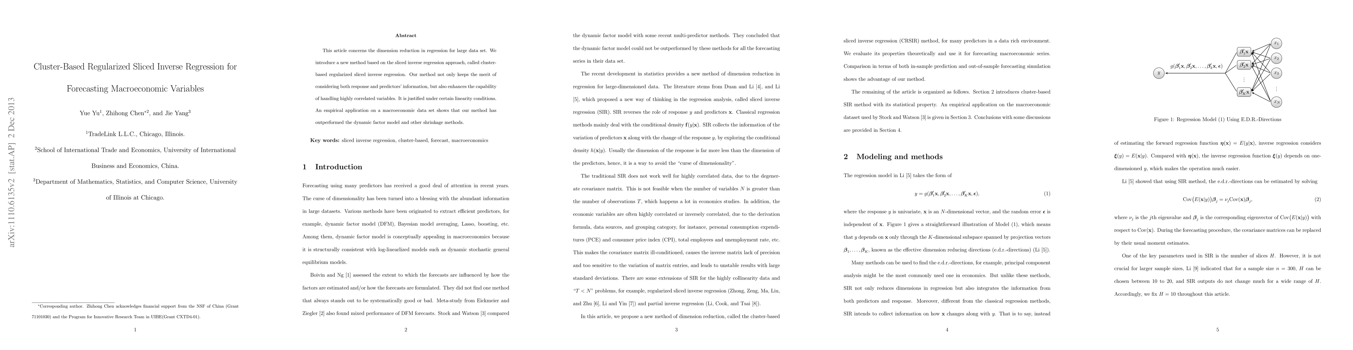 This paper proposes a cluster-based regularized sliced inverse regression method for dimension reduction in regression, effectively handling highly correlated variables and improving forecasting of macroeconomic variables. Empirical results show superior performance compared to the dynamic factor model and other shrinkage methods.