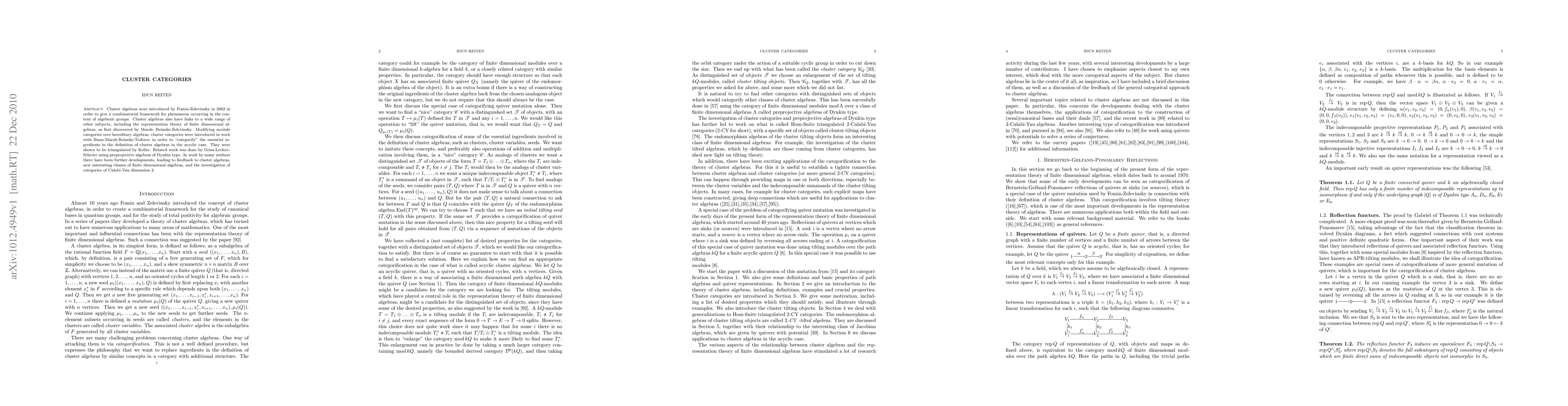 Cluster algebras were introduced by Fomin-Zelevinsky in 2002 in order to give a combinatorial framework for phenomena occurring in the context of algebraic groups. Cluster algebras also have links to a wide range of other subjects, including the representation theory of finite dimensional algebras, as first discovered by Marsh- Reineke-Zelevinsky. Modifying module categories over hereditary algebras, cluster categories were introduced in work with Buan-Marsh-Reineke-Todorov in order to "categorify" the essential ingredients in the definition of cluster algebras in the acyclic case. They were shown to be triangulated by Keller. Related work was done by Geiss-Leclerc-Schr\"oer using preprojective algebras of Dynkin type. In work by many authors there have been further developments, leading to feedback to cluster algebras, new interesting classes of finite dimensional algebras, and the investigation of categories of Calabi-Yau dimension $2.$