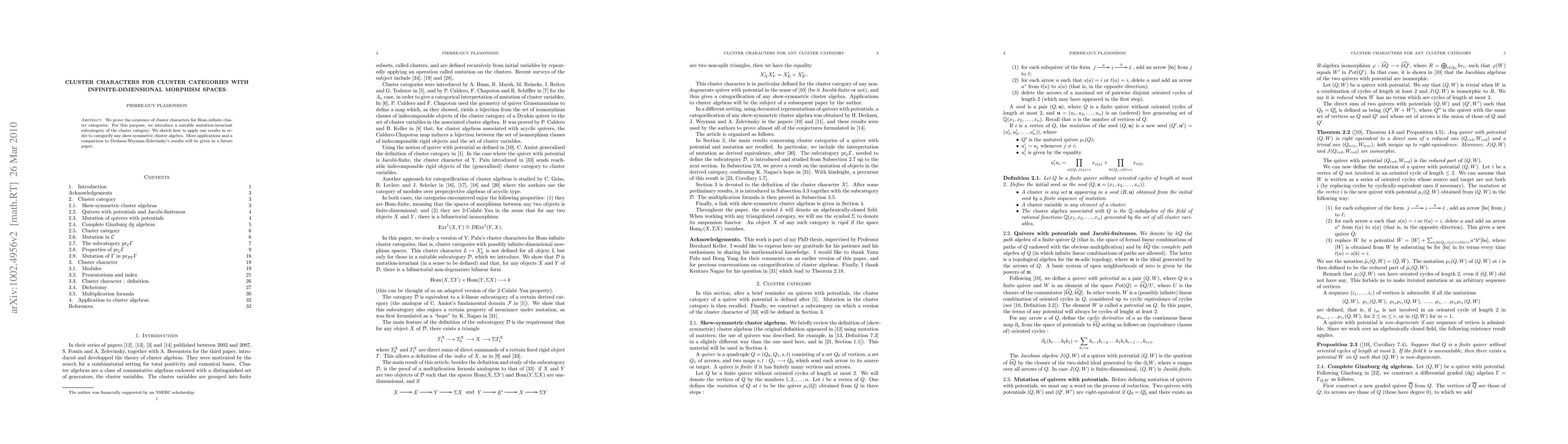 This paper establishes the existence of cluster characters for Hom-infinite cluster categories by introducing a mutation-invariant subcategory. It also outlines how these characters can be used to categorify skew-symmetric cluster algebras, with further applications and comparisons planned for future work.