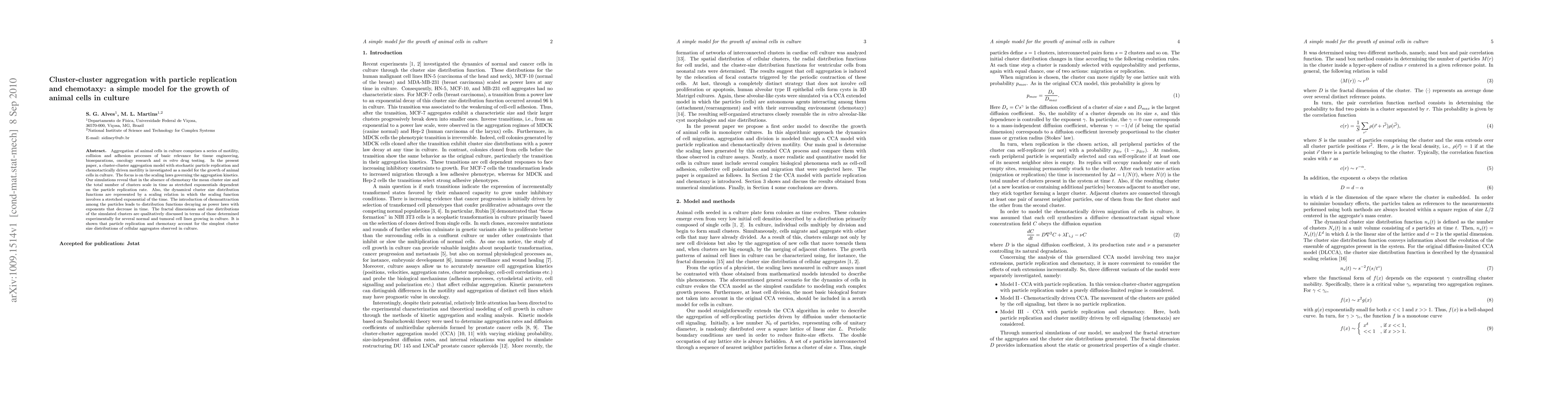 This paper investigates a cluster-cluster aggregation model with particle replication and chemotaxy to simulate the growth of animal cells in culture, focusing on scaling laws for aggregation kinetics. The study finds that without chemotaxy, cluster size and number scale as stretched exponentials, while chemoattraction leads to power-law decaying distribution functions.
