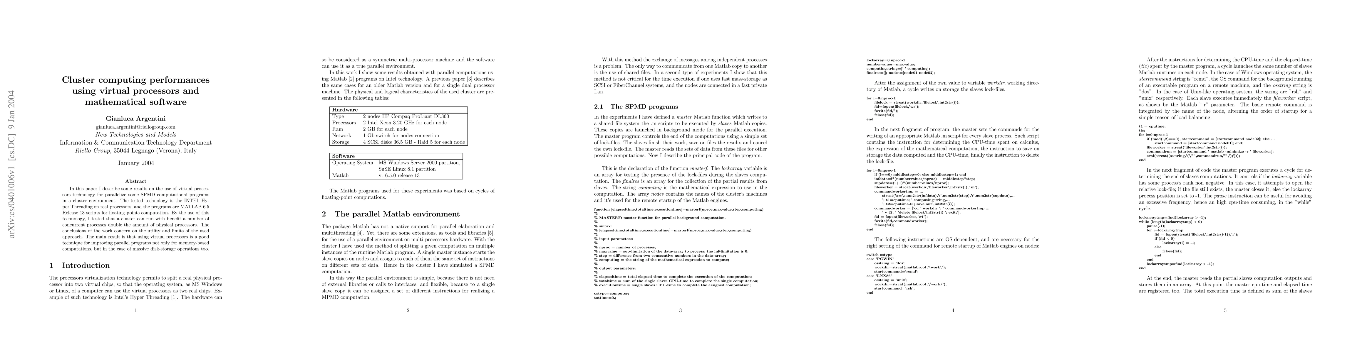 This paper explores the performance of cluster computing using Intel Hyper Threading technology to parallelize SPMD programs in MATLAB. The study finds that virtual processors can effectively double the number of concurrent processes compared to physical processors, enhancing both memory-based and disk-storage operations.