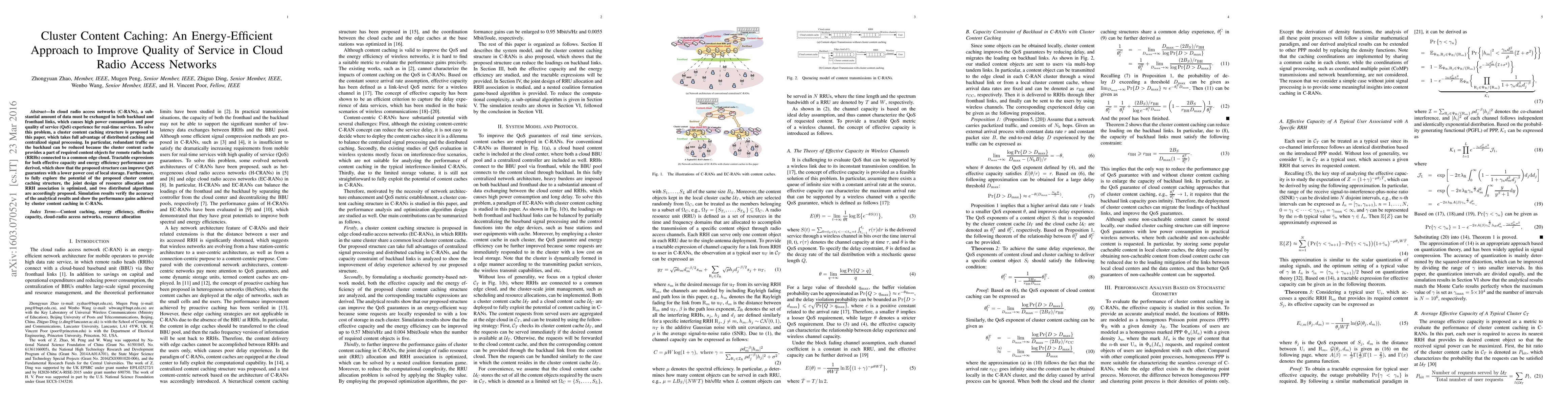 This paper proposes a cluster content caching approach to improve QoS in cloud radio access networks by reducing redundant backhaul traffic and optimizing resource allocation and RRH association, achieving better energy efficiency and QoS guarantees. Simulation results confirm the effectiveness of the proposed structure.