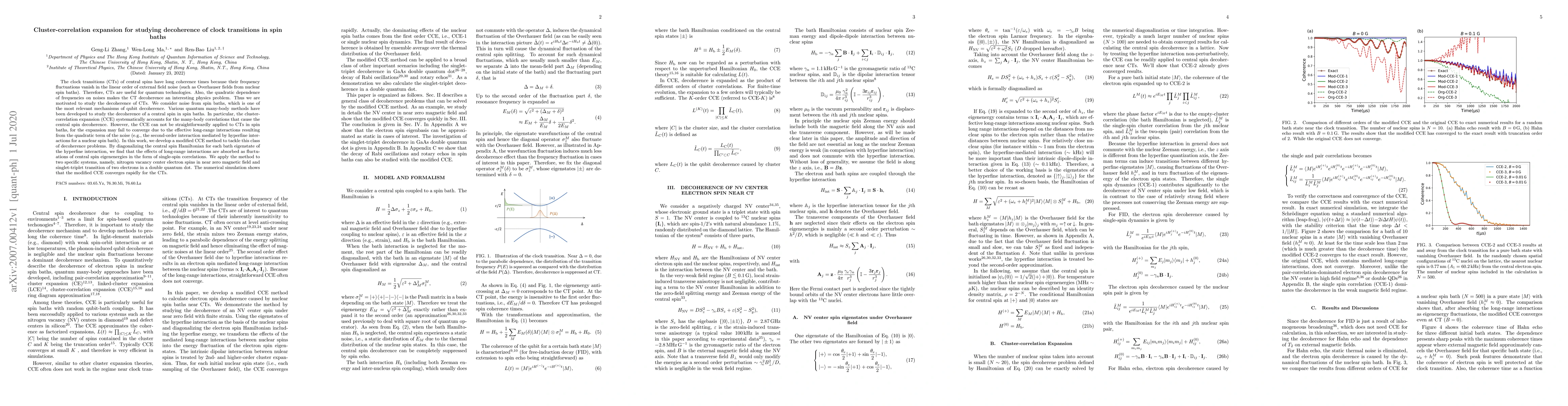 This paper develops a modified cluster-correlation expansion (CCE) method to study decoherence of clock transitions (CTs) in spin baths, addressing the failure of traditional CCE due to long-range interactions. The proposed method shows rapid convergence in simulations for systems like nitrogen vacancy centers and double quantum dots.