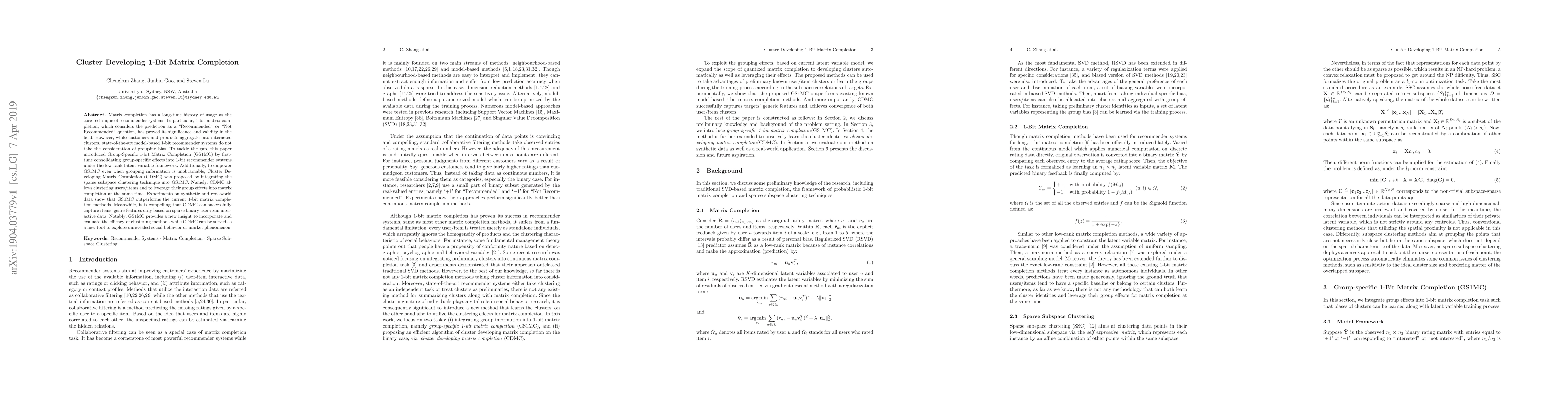 Matrix completion has a long-time history of usage as the core technique of recommender systems. In particular, 1-bit matrix completion, which considers the prediction as a ``Recommended'' or ``Not Recommended'' question, has proved its significance and validity in the field. However, while customers and products aggregate into interacted clusters, state-of-the-art model-based 1-bit recommender systems do not take the consideration of grouping bias. To tackle the gap, this paper introduced Group-Specific 1-bit Matrix Completion (GS1MC) by first-time consolidating group-specific effects into 1-bit recommender systems under the low-rank latent variable framework. Additionally, to empower GS1MC even when grouping information is unobtainable, Cluster Developing Matrix Completion (CDMC) was proposed by integrating the sparse subspace clustering technique into GS1MC. Namely, CDMC allows clustering users/items and to leverage their group effects into matrix completion at the same time. Experiments on synthetic and real-world data show that GS1MC outperforms the current 1-bit matrix completion methods. Meanwhile, it is compelling that CDMC can successfully capture items' genre features only based on sparse binary user-item interactive data. Notably, GS1MC provides a new insight to incorporate and evaluate the efficacy of clustering methods while CDMC can be served as a new tool to explore unrevealed social behavior or market phenomenon.