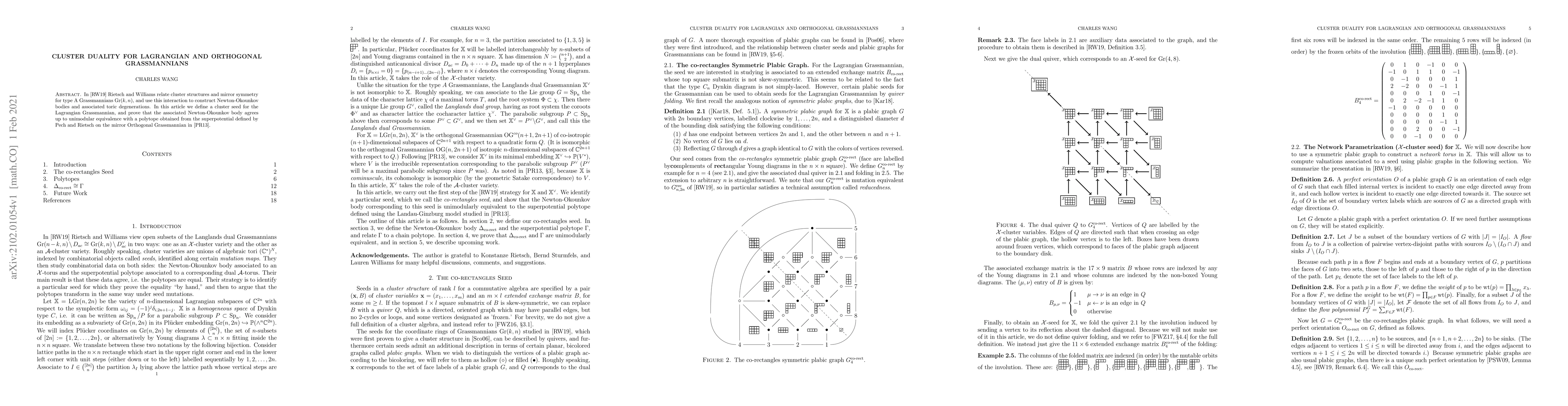 This paper defines a cluster seed for the Lagrangian Grassmannian and proves that its Newton-Okounkov body is unimodularly equivalent to a polytope from the superpotential on the mirror Orthogonal Grassmannian, extending the duality between cluster structures and mirror symmetry.