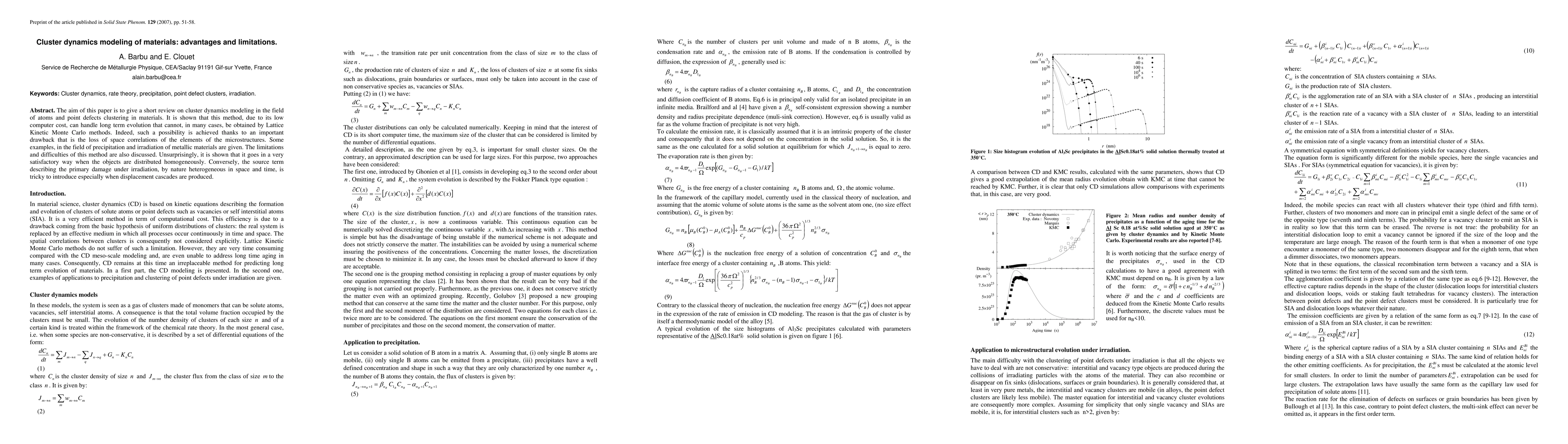 This paper reviews cluster dynamics modeling for atoms and point defects in materials, highlighting its cost-efficiency for long-term evolution over Lattice Kinetic Monte Carlo methods. It emphasizes the trade-off of losing spatial correlations but excels with homogeneously distributed objects, facing challenges with heterogeneous sources like irradiation-induced primary damage.