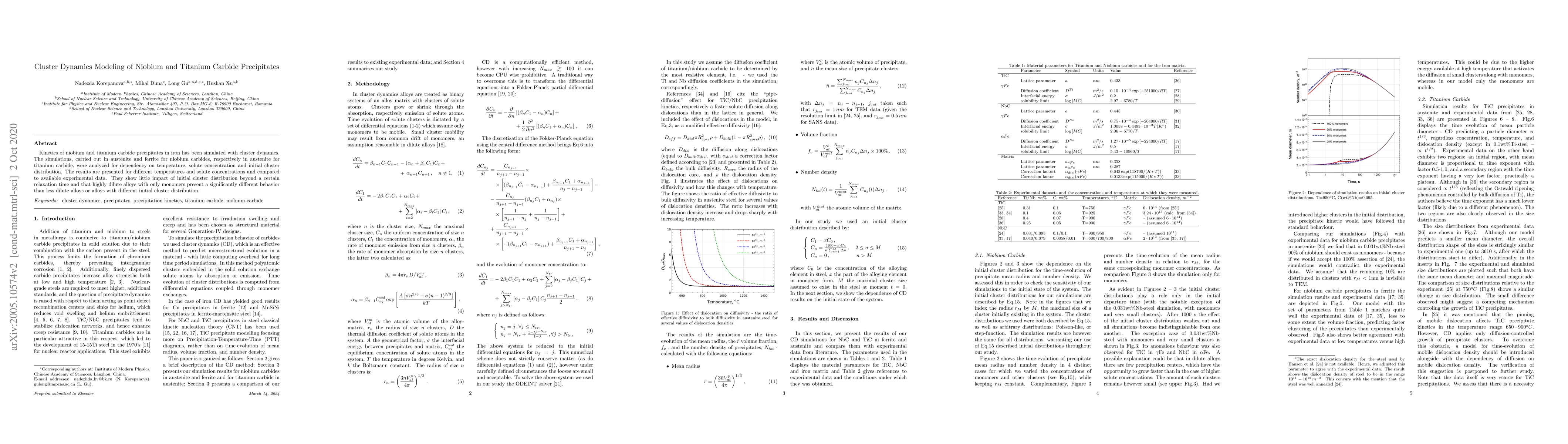 This paper simulates the kinetics of niobium and titanium carbide precipitates in iron using cluster dynamics, revealing minimal impact of initial cluster distribution after relaxation and highlighting distinct behaviors in highly dilute alloys compared to less dilute ones. The findings are corroborated with experimental data.