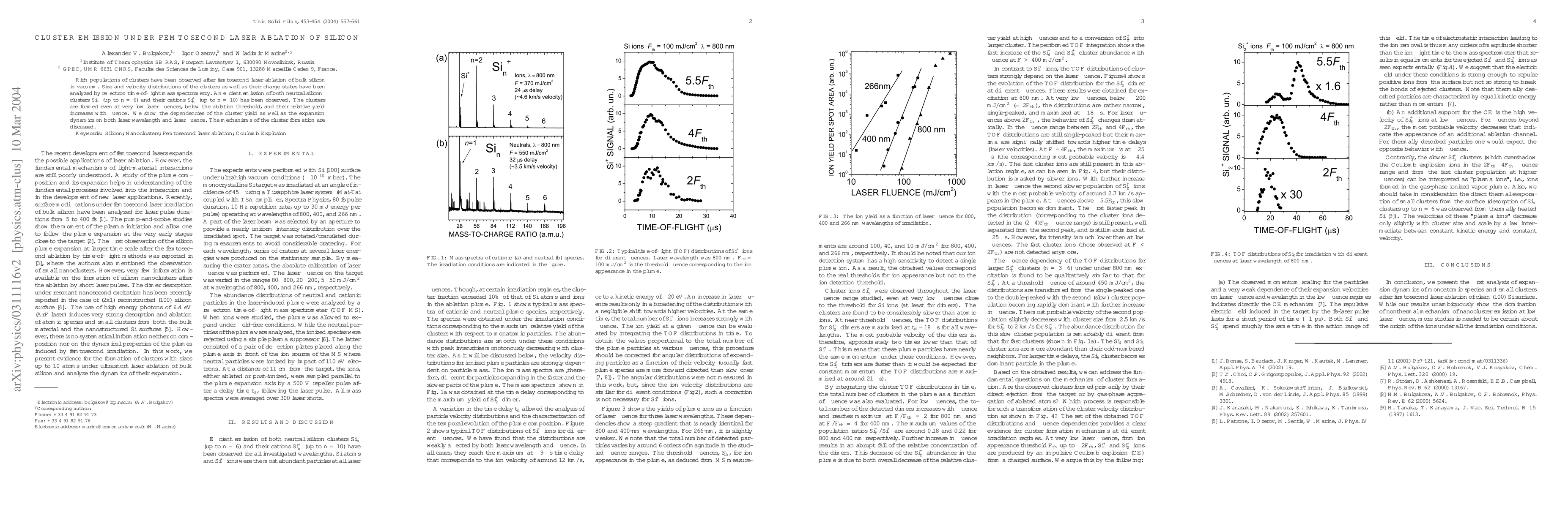 This study investigates the emission of silicon clusters following femtosecond laser ablation in vacuum, revealing efficient production of neutral clusters Sin (up to n = 6) and their cations Sin+ (up to n = 10). The research analyzes size, velocity, and charge state distributions using reflectron time-of-flight mass spectrometry, highlighting the influence of laser wavelength and fluence on cluster yield and dynamics.