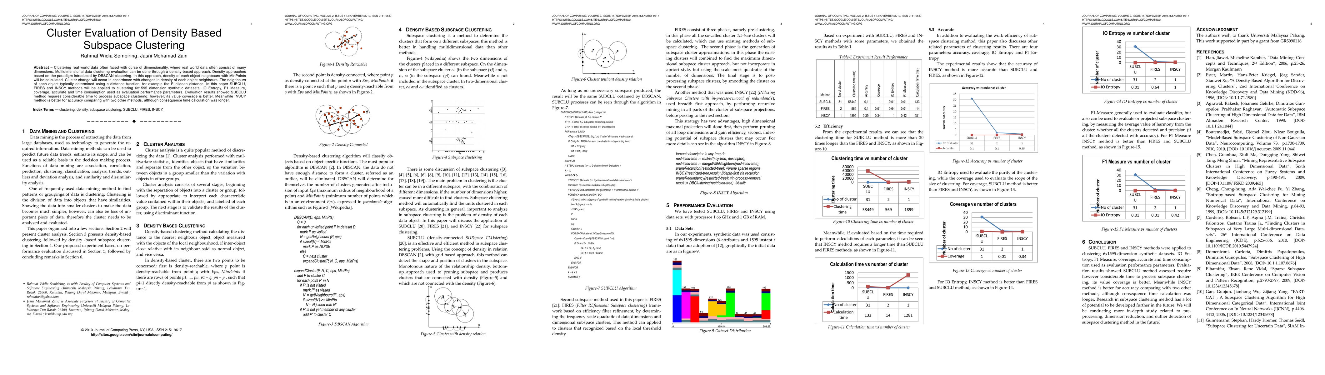 This paper evaluates density-based subspace clustering methods (SUBCLU, FIRES, INSCY) on high-dimensional synthetic datasets using IO Entropy, F1 Measure, coverage, accuracy, and time consumption. SUBCLU excels in coverage but is time-consuming, while INSCY offers better accuracy albeit with longer computation times.