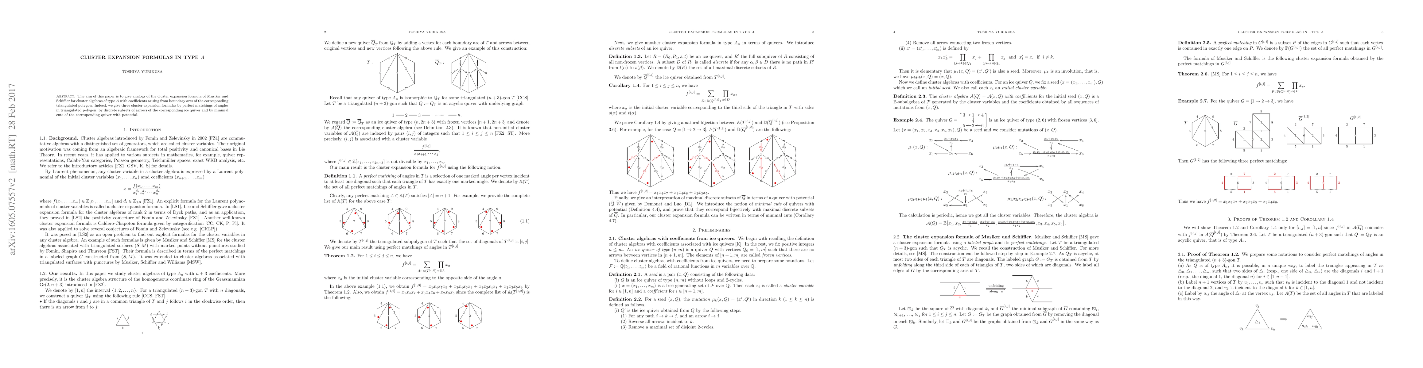 This paper develops cluster expansion formulas for type A cluster algebras, deriving coefficients from boundary arcs of triangulated polygons, and provides three distinct formulas through perfect matchings, discrete arrow subsets, and minimal cuts.