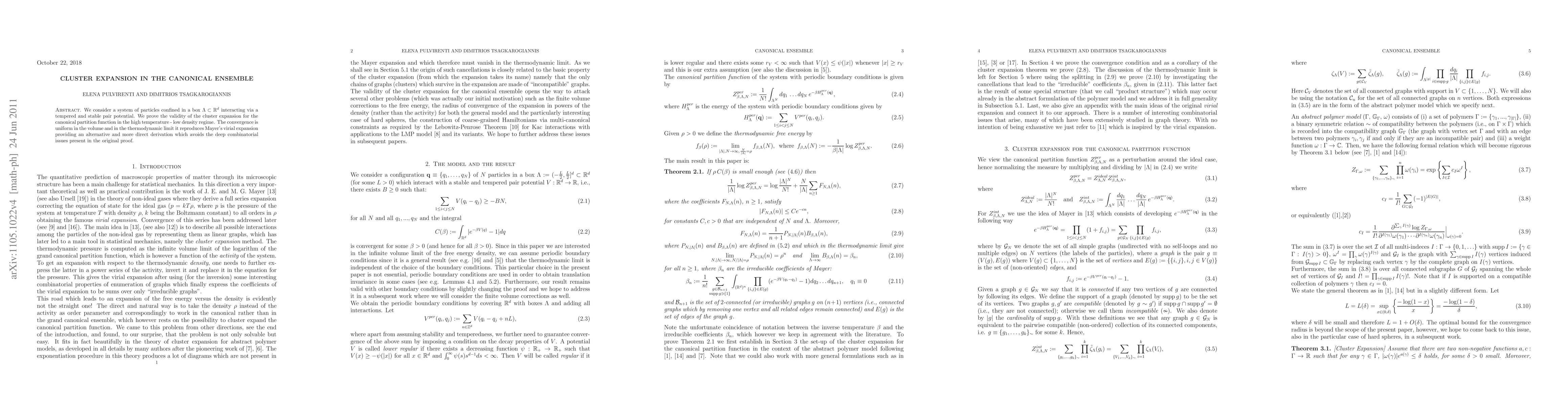 This paper proves the cluster expansion for the canonical partition function in systems of particles with tempered and stable pair potentials, showing its validity in the high temperature-low density regime. It provides a more direct derivation compared to the original proof, avoiding complex combinatorial issues.