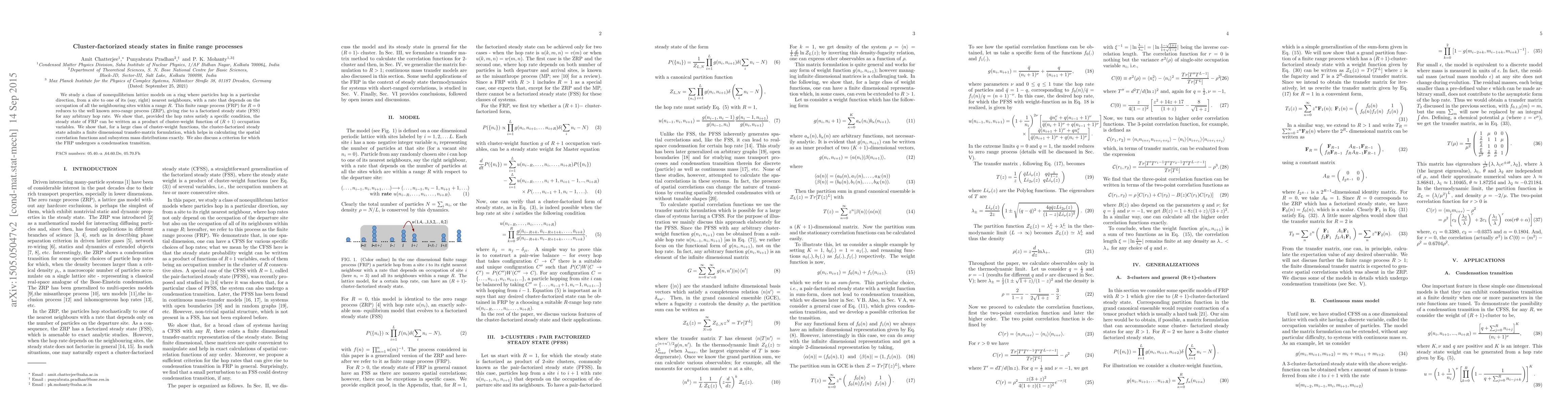 We study a class of nonequilibrium lattice models on a ring where particles hop in a particular direction, from a site to one of its (say, right) nearest neighbours, with a rate that depends on the occupation of all the neighbouring sites within a range R. This finite range process (FRP) for R=0 reduces to the well known zero-range process (ZRP), giving rise to a factorized steady state (FSS) for any arbitrary hop rate. We show that, provided the hop rates satisfy a specific condition, the steady state of FRP can be written as a product of cluster-weight function of (R+1) occupation variables. We show that, for a large class of cluster-weight functions, the cluster-factorized steady state admits a finite dimensional transfer-matrix formulation, which helps in calculating the spatial correlation functions and subsystem mass distributions exactly. We also discuss a criterion for which the FRP undergoes a condensation transition.