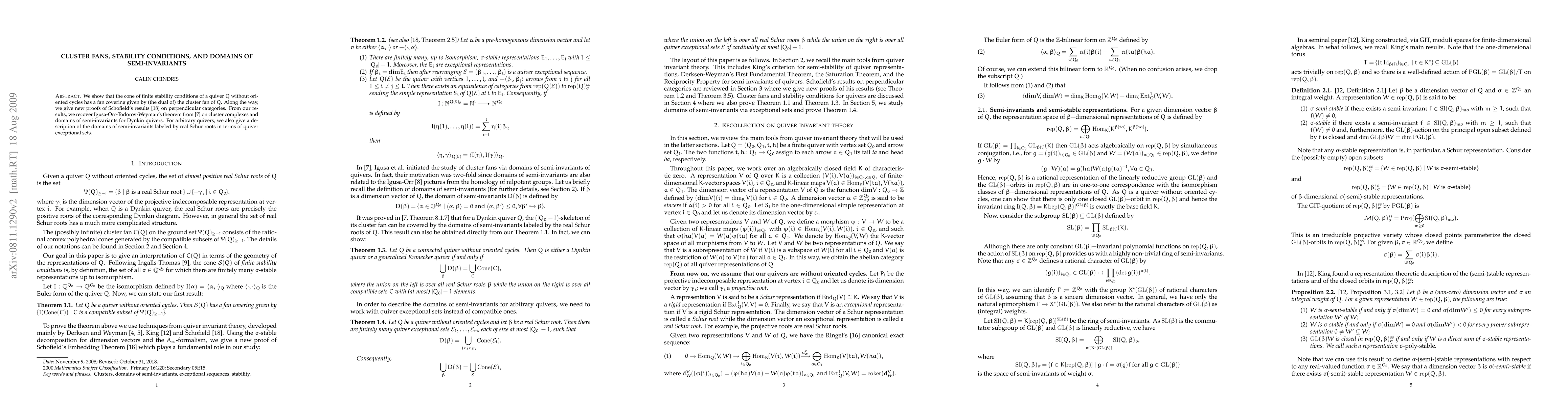 Researchers show that a specific fan of stability conditions can be covered by the cluster fan of a quiver Q, with implications for understanding semi-invariants and perpendicular categories.