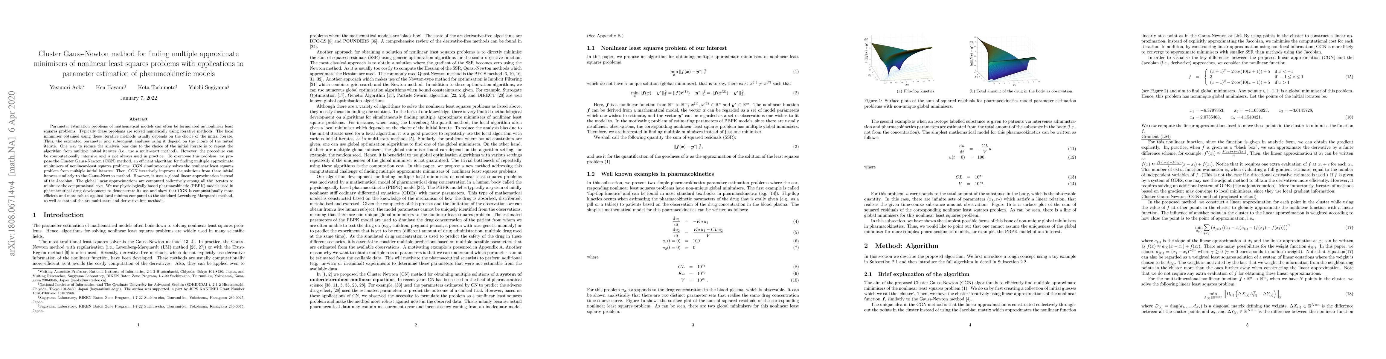 Parameter estimation problems of mathematical models can often be formulated as nonlinear least squares problems. Typically these problems are solved numerically using iterative methods. The local minimiserobtained using these iterative methods usually depends on the choice of the initial iterate. Thus, the estimated parameter and subsequent analyses using it depend on the choice of the initial iterate. One way to reduce the analysis bias due to the choice of the initial iterate is to repeat the algorithm from multiple initial iterates (i.e. use a multi-start method). However, the procedure can be computationally intensive and is not always used in practice. To overcome this problem, we propose the Cluster Gauss-Newton (CGN) method, an efficient algorithm for finding multiple approximate minimisers of nonlinear-least squares problems. CGN simultaneously solves the nonlinear least squares problem from multiple initial iterates. Then, CGN iteratively improves the solutions from these initial iterates similarly to the Gauss-Newton method. However, it uses a global linear approximation instead of the Jacobian. The global linear approximations are computed collectively among all the iterates to minimise the computational cost. We use physiologically based pharmacokinetic (PBPK) models used in pharmaceutical drug development to demonstrate its use and show that CGN is computationally more efficient and more robust against local minima compared to the standard Levenberg-Marquardt method, as well as state-of-the art multi-start and derivative-free methods.