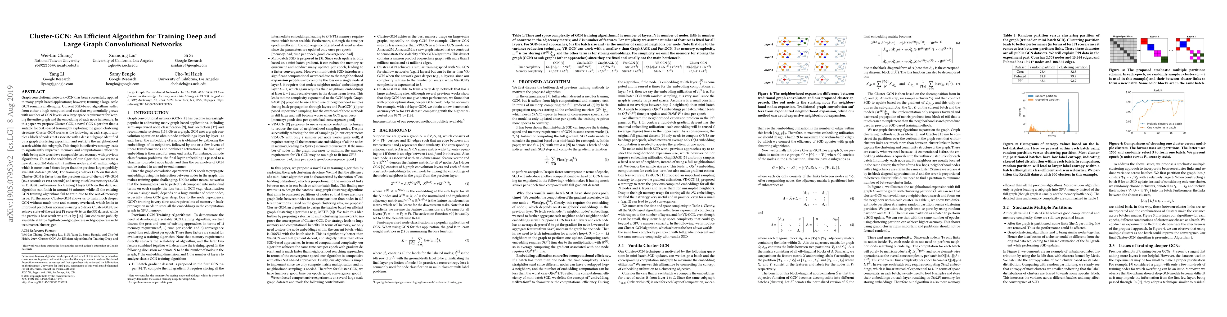Graph convolutional network (GCN) has been successfully applied to many graph-based applications; however, training a large-scale GCN remains challenging. Current SGD-based algorithms suffer from either a high computational cost that exponentially grows with number of GCN layers, or a large space requirement for keeping the entire graph and the embedding of each node in memory. In this paper, we propose Cluster-GCN, a novel GCN algorithm that is suitable for SGD-based training by exploiting the graph clustering structure. Cluster-GCN works as the following: at each step, it samples a block of nodes that associate with a dense subgraph identified by a graph clustering algorithm, and restricts the neighborhood search within this subgraph. This simple but effective strategy leads to significantly improved memory and computational efficiency while being able to achieve comparable test accuracy with previous algorithms. To test the scalability of our algorithm, we create a new Amazon2M data with 2 million nodes and 61 million edges which is more than 5 times larger than the previous largest publicly available dataset (Reddit). For training a 3-layer GCN on this data, Cluster-GCN is faster than the previous state-of-the-art VR-GCN (1523 seconds vs 1961 seconds) and using much less memory (2.2GB vs 11.2GB). Furthermore, for training 4 layer GCN on this data, our algorithm can finish in around 36 minutes while all the existing GCN training algorithms fail to train due to the out-of-memory issue. Furthermore, Cluster-GCN allows us to train much deeper GCN without much time and memory overhead, which leads to improved prediction accuracy---using a 5-layer Cluster-GCN, we achieve state-of-the-art test F1 score 99.36 on the PPI dataset, while the previous best result was 98.71 by [16]. Our codes are publicly available at https://github.com/google-research/google-research/tree/master/cluster_gcn.