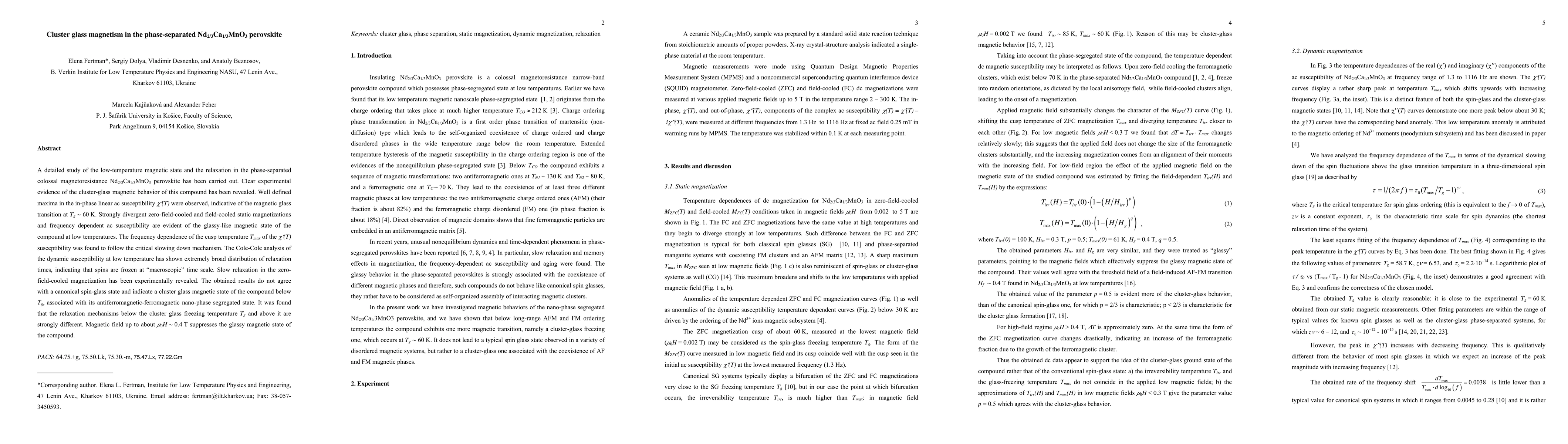 A detailed study of the low-temperature magnetic state and the relaxation in the phase-separated colossal magnetoresistance Nd2/3Ca1/3MnO3 perovskite has been carried out. Clear experimental evidence of the cluster-glass magnetic behavior of this compound has been revealed. Well defined maxima in the in-phase linear ac susceptibility $\chi ^{/}(T)$ were observed, indicative of the magnetic glass transition at $T_{g}$ = 60 K. Strongly divergent zero-field-cooled and field-cooled static magnetizations and frequency dependent ac susceptibility are evident of the glassy-like magnetic state of the compound at low temperatures. The frequency dependence of the cusp temperature Tmax of the $\chi ^{/}(T)$ susceptibility was found to follow the critical slowing down mechanism. The Cole-Cole analysis of the dynamic susceptibility at low temperature has shown extremely broad distribution of relaxation times, indicating that spins are frozen at "macroscopic" time scale. Slow relaxation in the zero-field-cooled magnetization has been experimentally revealed. The obtained results do not agree with a canonical spin-glass state and indicate a cluster glass magnetic state of the compound below $T_{g}$, associated with its antiferromagnetic-ferromagnetic nano-phase segregated state. It was found that the relaxation mechanisms below the cluster glass freezing temperature $T_{g}$ and above it are strongly different. Magnetic field up to about $\mu_{0}$H = 0.4 T suppresses the glassy magnetic state of the compound.