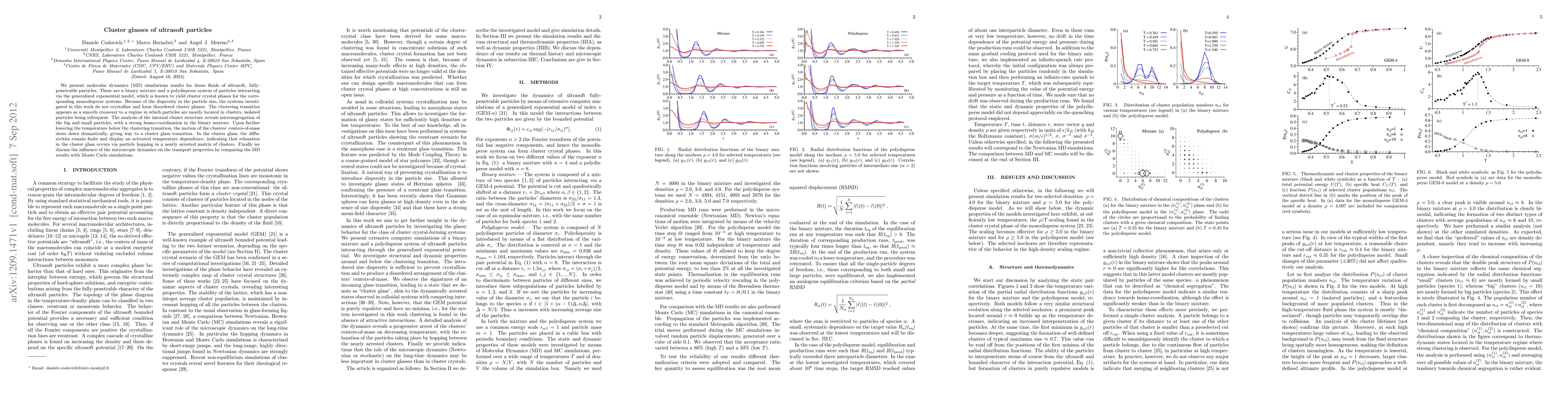 We present molecular dynamics (MD) simulations results for dense fluids of ultrasoft, fully-penetrable particles. These are a binary mixture and a polydisperse system of particles interacting via the generalized exponential model, which is known to yield cluster crystal phases for the corresponding monodisperse systems. Because of the dispersity in the particle size, the systems investigated in this work do not crystallize and form disordered cluster phases. The clustering transition appears as a smooth crossover to a regime in which particles are mostly located in clusters, isolated particles being infrequent. The analysis of the internal cluster structure reveals microsegregation of the big and small particles, with a strong homo-coordination in the binary mixture. Upon further lowering the temperature below the clustering transition, the motion of the clusters' centers-of-mass slows down dramatically, giving way to a cluster glass transition. In the cluster glass, the diffusivities remain finite and display an activated temperature dependence, indicating that relaxation in the cluster glass occurs via particle hopping in a nearly arrested matrix of clusters. Finally we discuss the influence of the microscopic dynamics on the transport properties by comparing the MD results with Monte Carlo simulations.