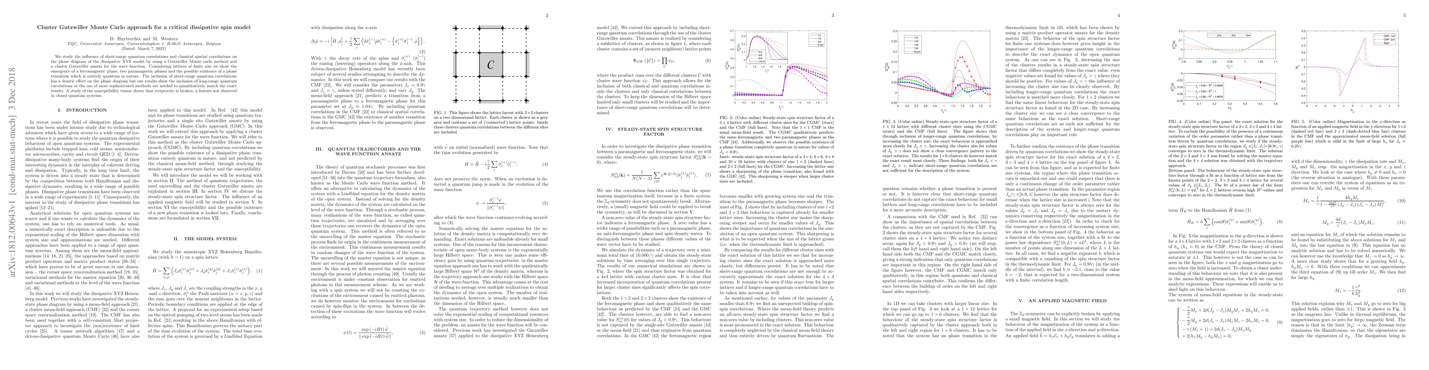 We study the influence of short-range quantum correlations and classical spatial correlations on the phase diagram of the dissipative XYZ model by using a Gutzwiller Monte carlo method and a cluster Gutzwiller ansatz for the wave function. Considering lattices of finite size we show the emergence of a ferromagnetic phase, two paramagnetic phases and the possible existence of a phase transition which is entirely quantum in nature. The inclusion of short-range quantum correlations has a drastic effect on the phase diagram but our results show the inclusion of long-range quantum correlations or the use of more sophisticated methods are needed to quantitatively match the exact results. A study of the susceptibility tensor shows that reciprocity is broken, a feature not observed in closed quantum systems.