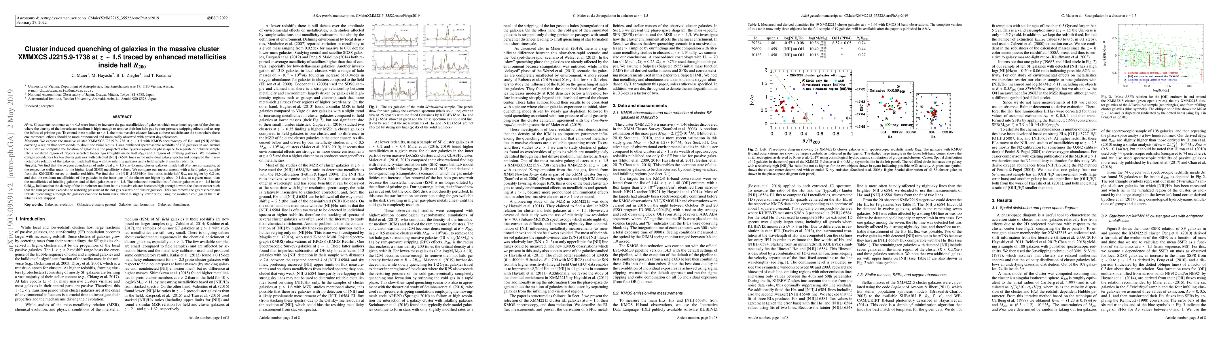 This study investigates the massive cluster XMMXCSJ2215.9-1738 at z~1.5, finding that galaxies within half of the cluster's virial radius exhibit enhanced metallicities compared to infalling and field galaxies. The elevated metallicities suggest that the intracluster medium's density is high enough to initiate quenching through gas removal, despite continued star formation.
