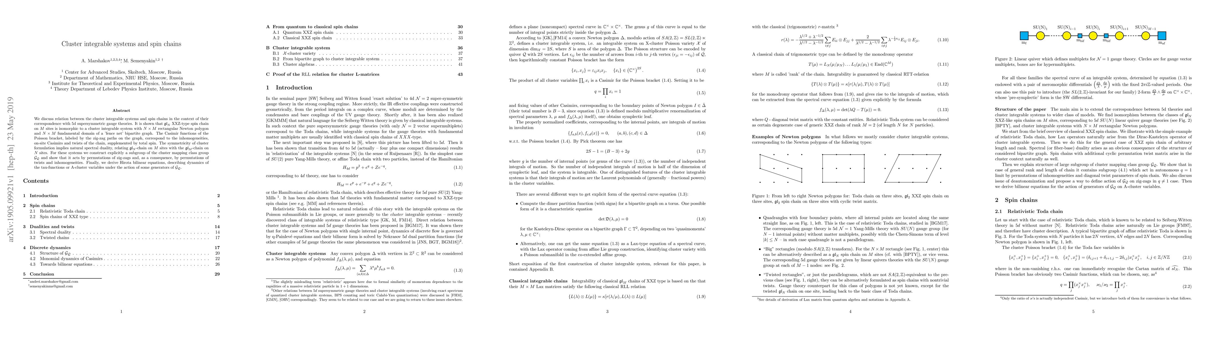 We discuss relation between the cluster integrable systems and spin chains in the context of their correspondence with 5d supersymmetric gauge theories. It is shown that $\mathfrak{gl}_N$ XXZ-type spin chain on $M$ sites is isomorphic to a cluster integrable system with $N \times M$ rectangular Newton polygon and $N \times M$ fundamental domain of a 'fence net' bipartite graph. The Casimir functions of the Poisson bracket, labeled by the zig-zag paths on the graph, correspond to the inhomogeneities, on-site Casimirs and twists of the chain, supplemented by total spin. The symmetricity of cluster formulation implies natural spectral duality, relating $\mathfrak{gl}_N$-chain on $M$ sites with the $\mathfrak{gl}_M$-chain on $N$ sites. For these systems we construct explicitly a subgroup of the cluster mapping class group $\mathcal{G}_\mathcal{Q}$ and show that it acts by permutations of zig-zags and, as a consequence, by permutations of twists and inhomogeneities. Finally, we derive Hirota bilinear equations, describing dynamics of the tau-functions or A-cluster variables under the action of some generators of $\mathcal{G}_\mathcal{Q}$.
