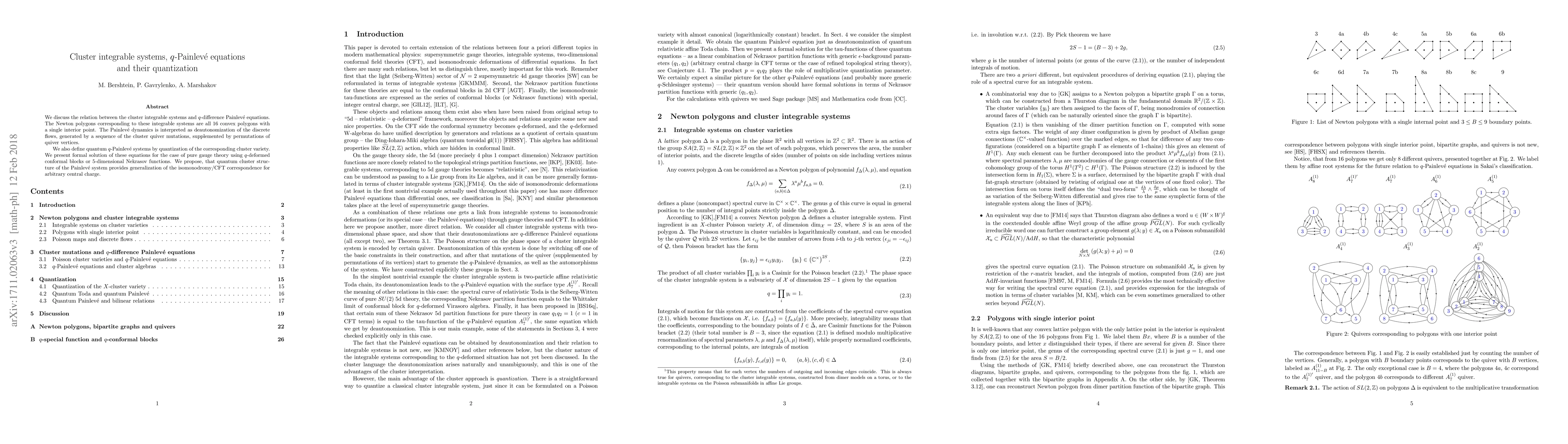 This paper explores the connection between cluster integrable systems and $q$-Painlevé equations, showing that their Newton polygons are 16 convex polygons with a single interior point. It interprets Painlevé dynamics as deautonomization of discrete flows from cluster quiver mutations. The paper also quantizes these systems, presenting solutions for pure gauge theory using $q$-deformed conformal blocks, and proposes a generalization of the isomonodromy/CFT correspondence via quantum cluster structures.