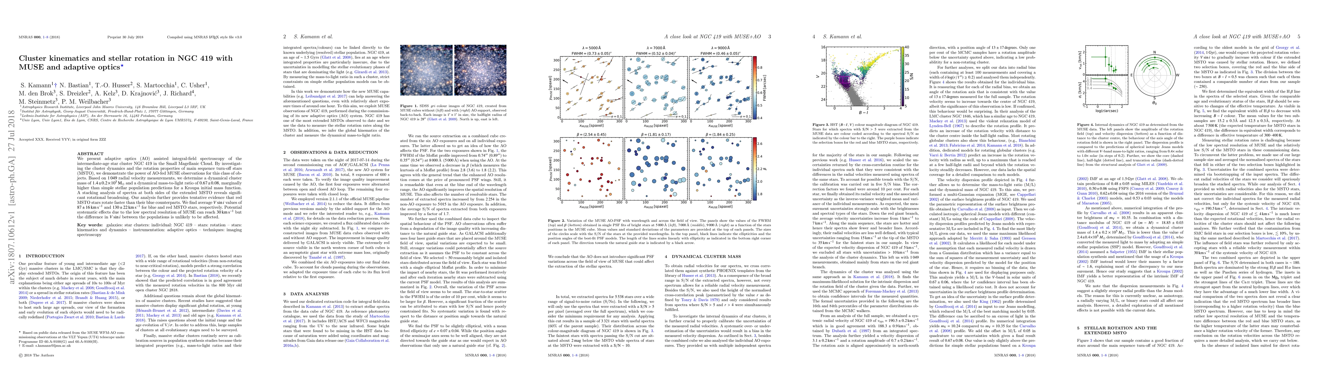 We present adaptive optics (AO) assisted integral-field spectroscopy of the intermediate-age star cluster NGC 419 in the Small Magellanic Cloud. By investigating the cluster dynamics and the rotation properties of main sequence turn-off stars (MSTO), we demonstrate the power of AO-fed MUSE observations for this class of objects. Based on 1 049 radial velocity measurements, we determine a dynamical cluster mass of 1.4+/-0.2x10^5 M_sun and a dynamical mass-to-light ratio of 0.67+/-0.08, marginally higher than simple stellar population predictions for a Kroupa initial mass function. A stacking analysis of spectra at both sides of the extended MSTO reveals significant rotational broadening. Our analysis further provides tentative evidence that red MSTO stars rotate faster than their blue counterparts. We find average V sin i values of 87+/-16 km/s and 130+/-22 km/s for blue and red MSTO stars, respectively. Potential systematic effects due to the low spectral resolution of MUSE can reach 30 km/s but the difference in V sin i between the populations is unlikely to be affected.