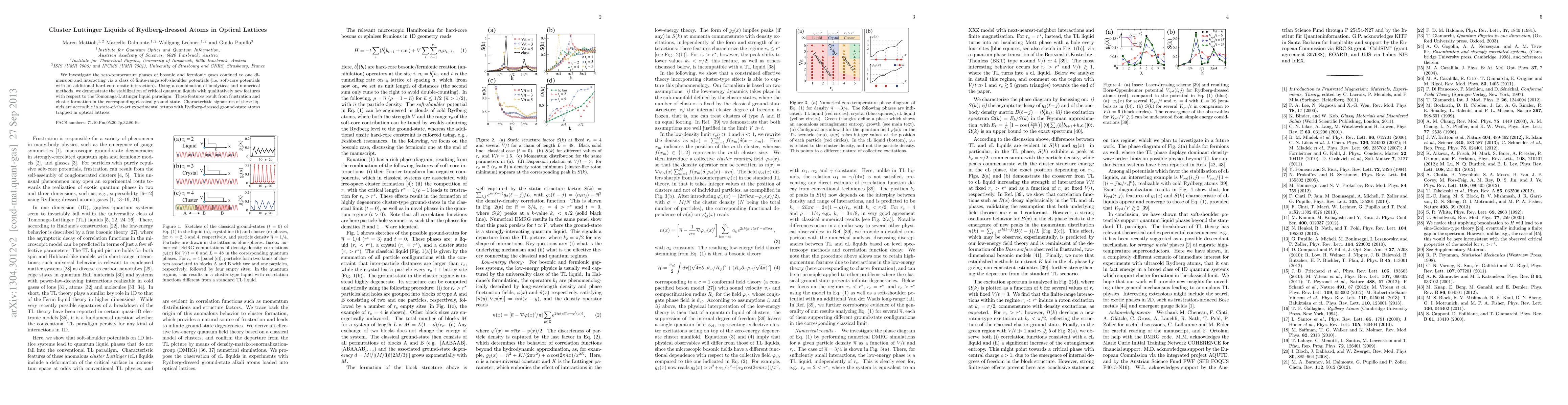 This paper explores the zero-temperature phases of one-dimensional bosonic and fermionic gases interacting via soft-core potentials, revealing the stabilization of novel cluster Luttinger liquids due to classical ground-state frustration and cluster formation. These findings are experimentally accessible in current optical lattice setups using Rydberg-dressed atoms.