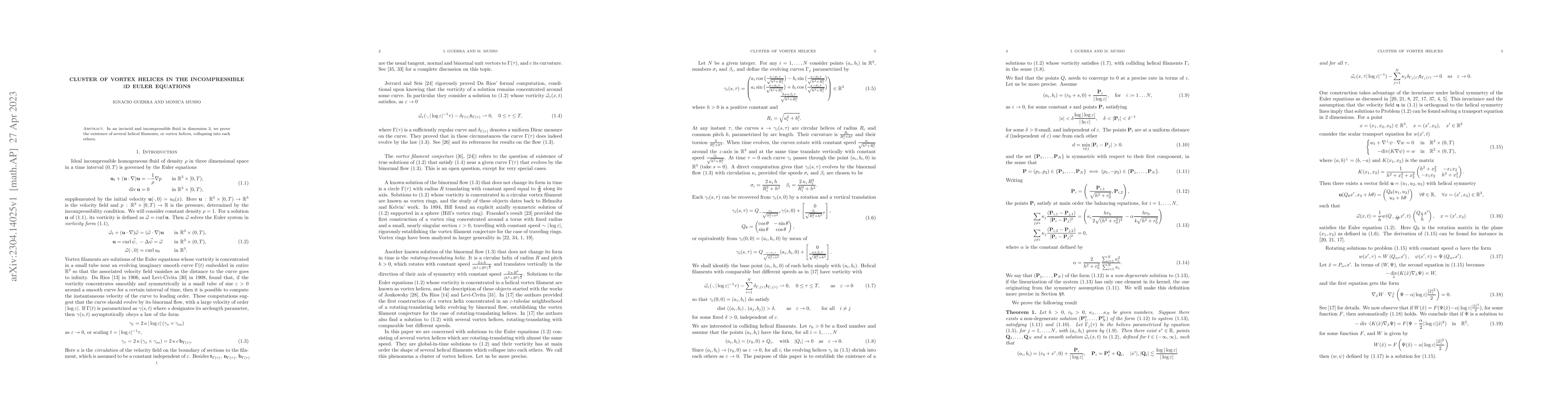 Summary: The paper proves the existence of multiple vortex helices in an inviscid, incompressible 3D fluid that collapse into each other, forming a cluster of helical filaments. This discovery provides insight into complex fluid dynamics phenomena.