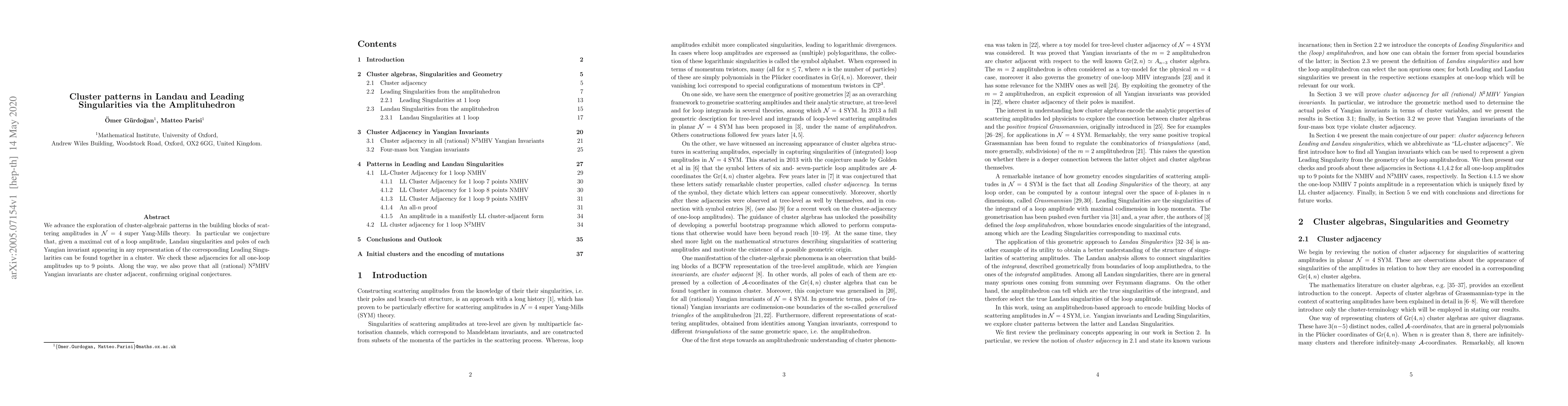 We advance the exploration of cluster-algebraic patterns in the building blocks of scattering amplitudes in $\mathcal{N}=4$ super Yang-Mills theory. In particular we conjecture that, given a maximal cut of a loop amplitude, Landau singularities and poles of each Yangian invariant appearing in any representation of the corresponding Leading Singularities can be found together in a cluster. We check these adjacencies for all one-loop amplitudes up to 9 points. Along the way, we also prove that all (rational) N$^2$MHV Yangian invariants are cluster adjacent, confirming original conjectures.