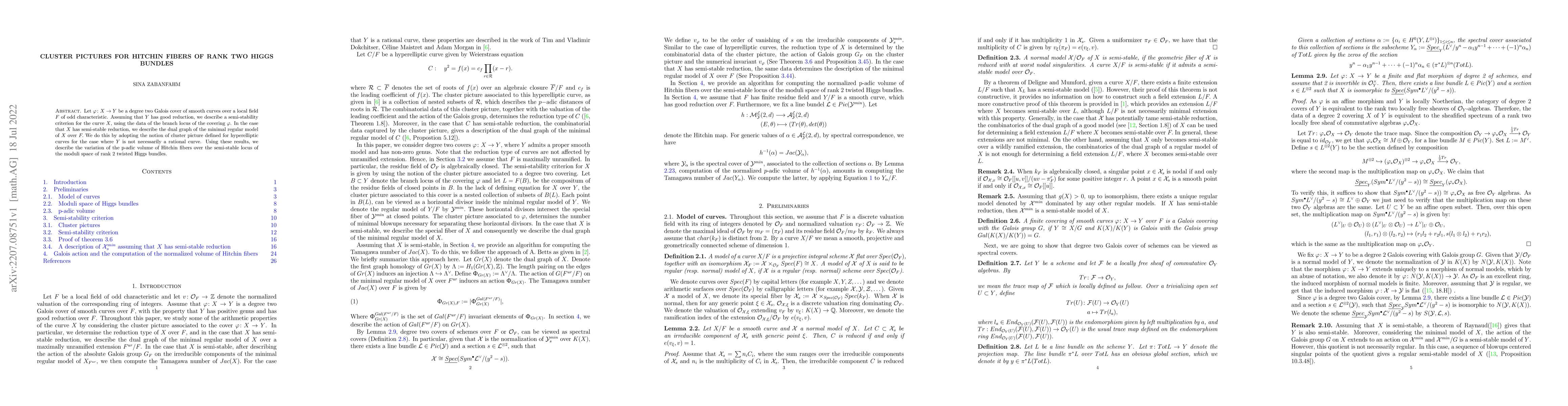 This paper explores a semi-stability criterion for a degree two Galois cover of smooth curves over a local field, using cluster pictures defined for hyperelliptic curves. It also investigates the variation of p-adic volume of Hitchin fibers over the semi-stable locus of rank 2 twisted Higgs bundles.