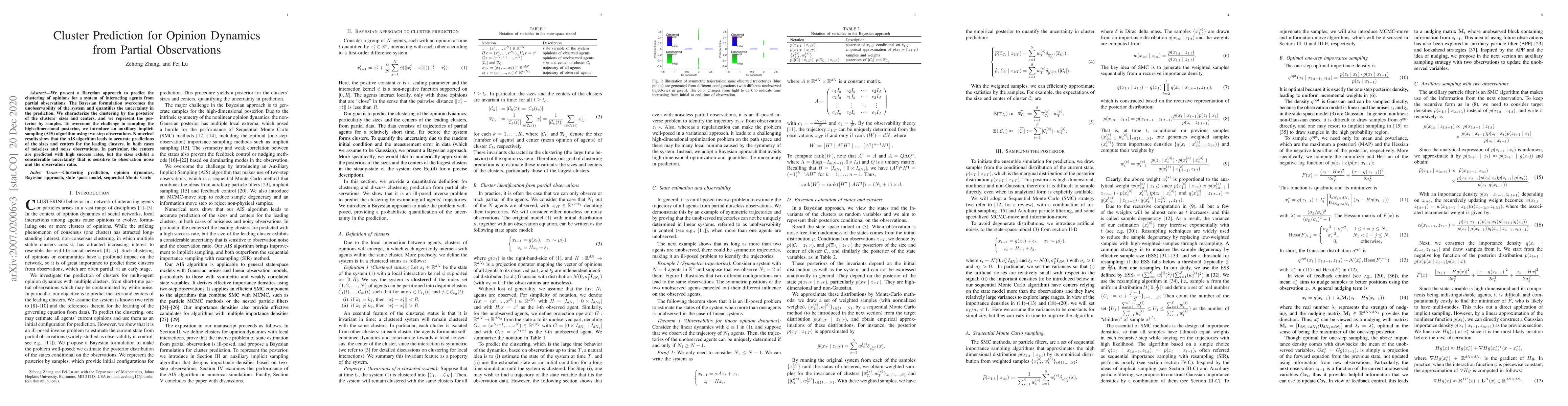 This paper proposes a Bayesian method to predict opinion clustering in interacting agents from partial observations, addressing the challenge of system unobservability. An auxiliary implicit sampling algorithm is introduced to efficiently sample the high-dimensional posterior, achieving accurate predictions of cluster centers despite considerable uncertainty in cluster sizes influenced by noise and observation ratio.